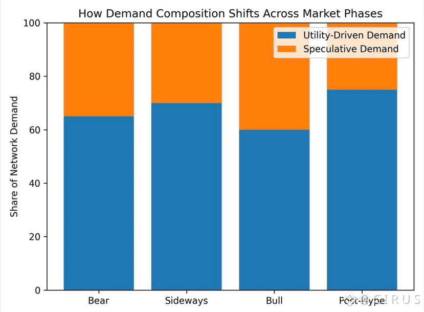 Market behavior reflects this. Speculative tokens tend to show high volatility tied to sentiment. Utility-driven tokens often show quieter price action, punctuated by gradual increases in baseline demand. This can be misinterpreted as lack of excitement. In reality, it often signals that usage is decoupled from hype. The network continues to operate whether or not it is being discussed on social media.