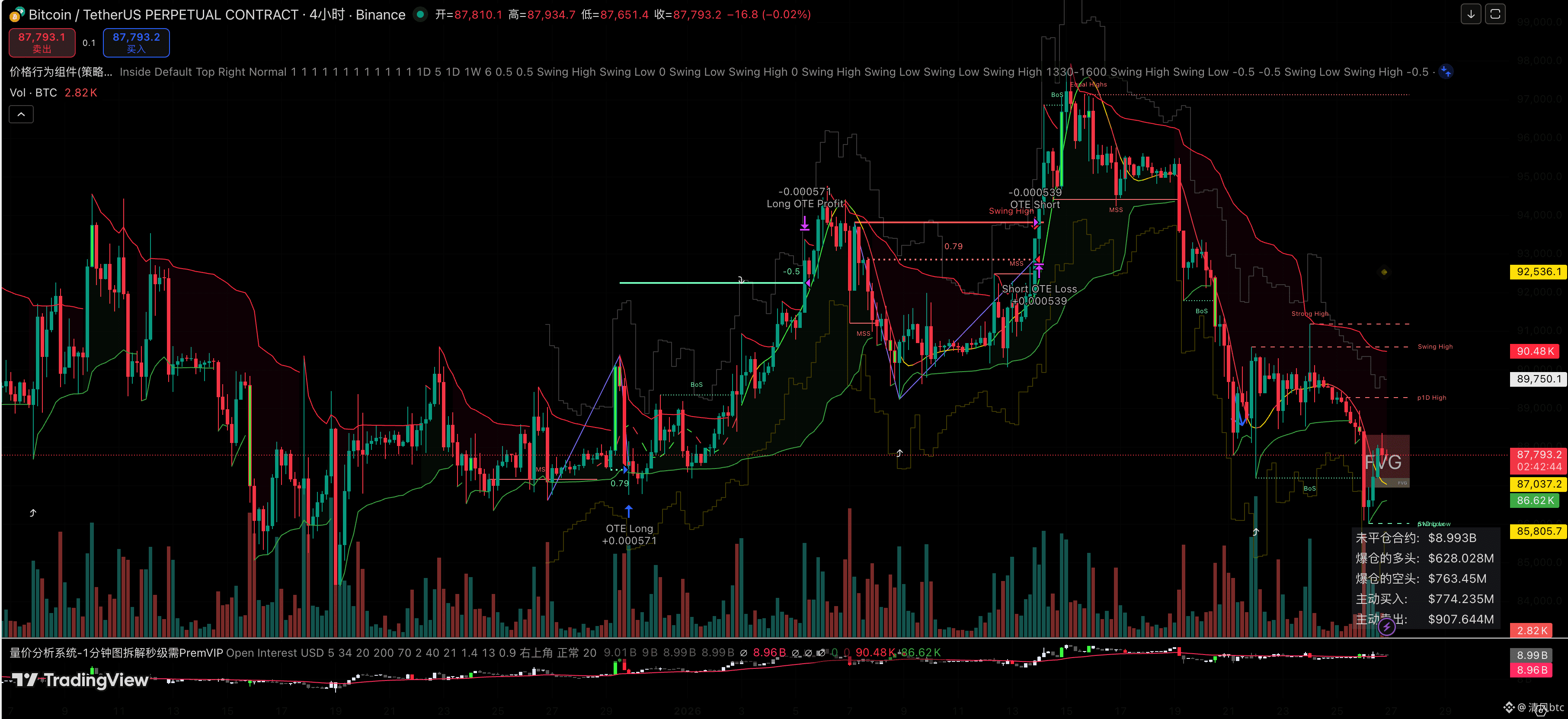 当前价格运行在 87,700 一线,正处于一个关键的 FVG (公平价值缺口) 区域。上方 90,400 - 91,000 区间已形成强阻力带(Supply Zone)。除非 4小时级别能放量实体收在 91,000 之上,否则所有的反弹都应视为“死猫跳”,是空头回补而非反转。下方关键支撑: