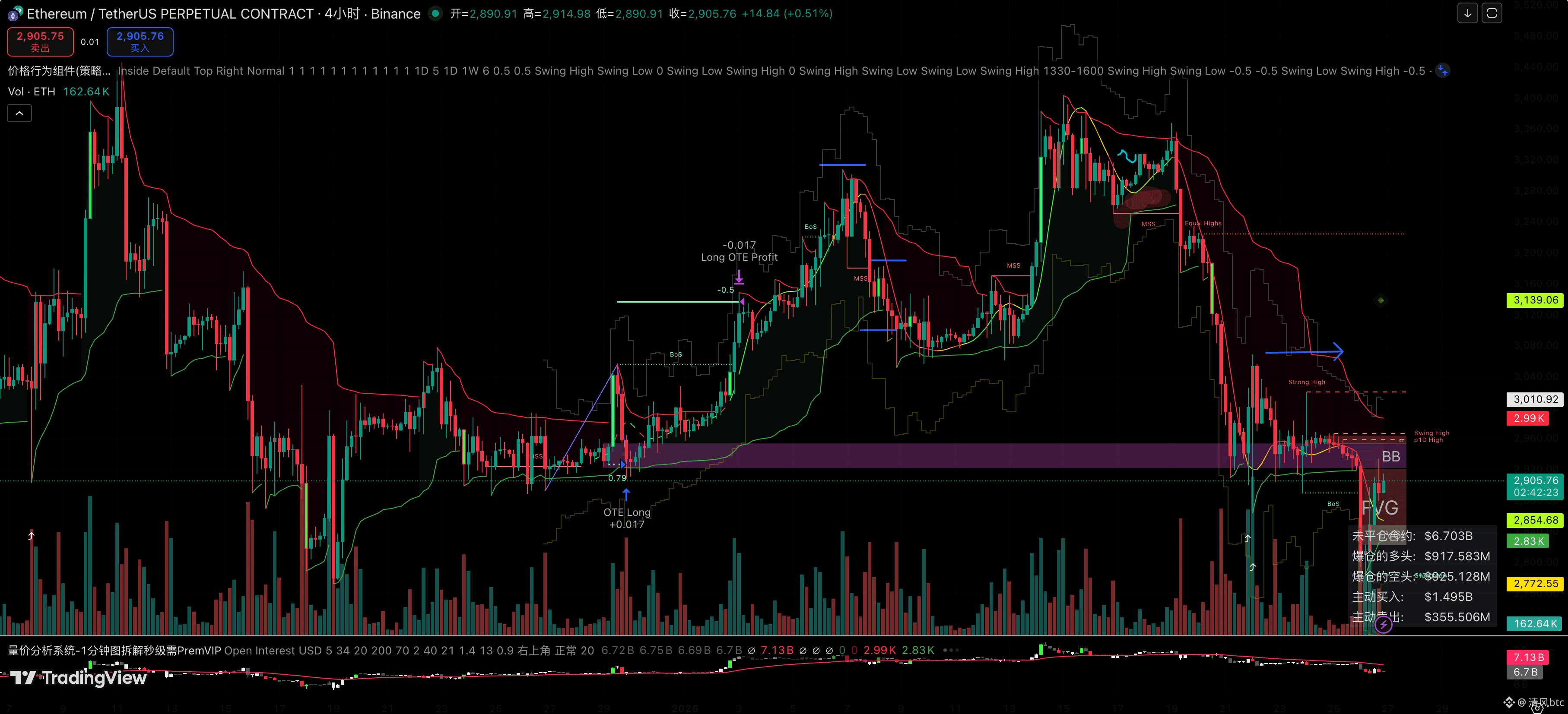 ETH 目前报价 2,902,价格精准地卡在 4小时级别的 紫色需求区 (Demand Zone) 边缘。这是一个极度敏感的位置。从图表结构看,上方 3,010 已经构筑了 Strong High (强高点),这意味着只要价格维持在 3,000 以下,空头结构依然稳固。经典的 OTE 回撤逻辑: