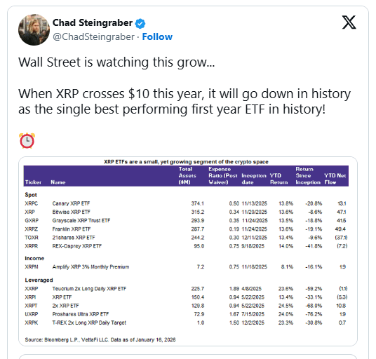 Стейнграбер подчеркнул, что если XRP превысит 10 долларов в этом году, это будет зафиксировано как самый высокоэффективный ETF за первый год в истории. Этот прогноз ставит ETF XRP на передний план институционального интереса в крипто-секторе.