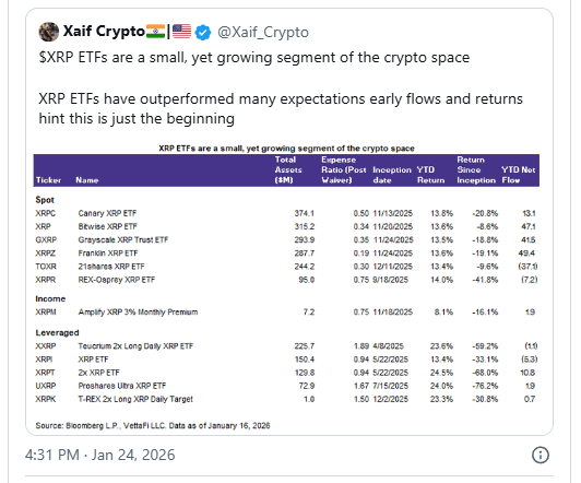 Пост Стейнгабрара включал подробные данные о нескольких ETF XRP, демонстрируя как рост, так и ранние доходы. ETF Canary XRP, который побил рекорды при запуске, ведет с общими активами в $374.1 миллиона и доходностью 13.8% с начала года. ETF Bitwise XRP следует с $315.2 миллиона и доходностью 13.6% с начала года.