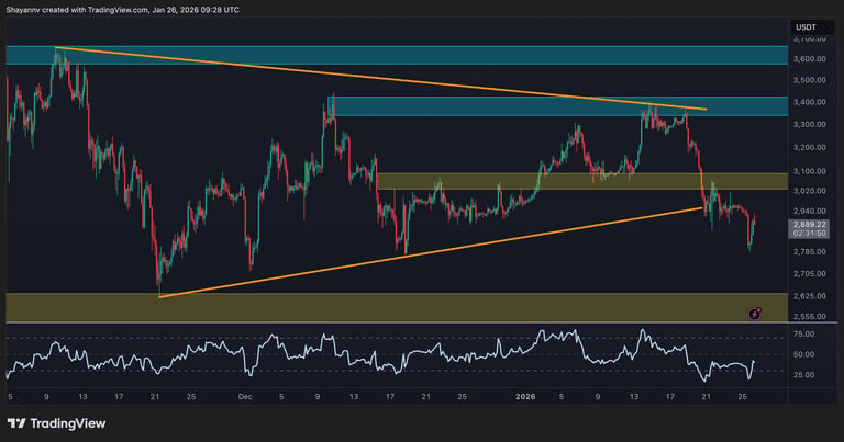 В краткосрочной перспективе (графики на 4 часа) треугольник поддержки, который мы наблюдали с ноября, сломался. Теперь 3,000$, которые раньше были нашим надежным полом, превратились в труднопреодолимую крышу. Если ETH не сможет скоро восстановить эту отметку, давление будет продолжать подталкивать нас к зоне спроса на 2,500$. Мы находимся в моменте максимального терпения, где технический анализ говорит нам "осторожно", но фундаментальный анализ говорит, что сеть продолжает жить и активна как никогда. 🏗️💎