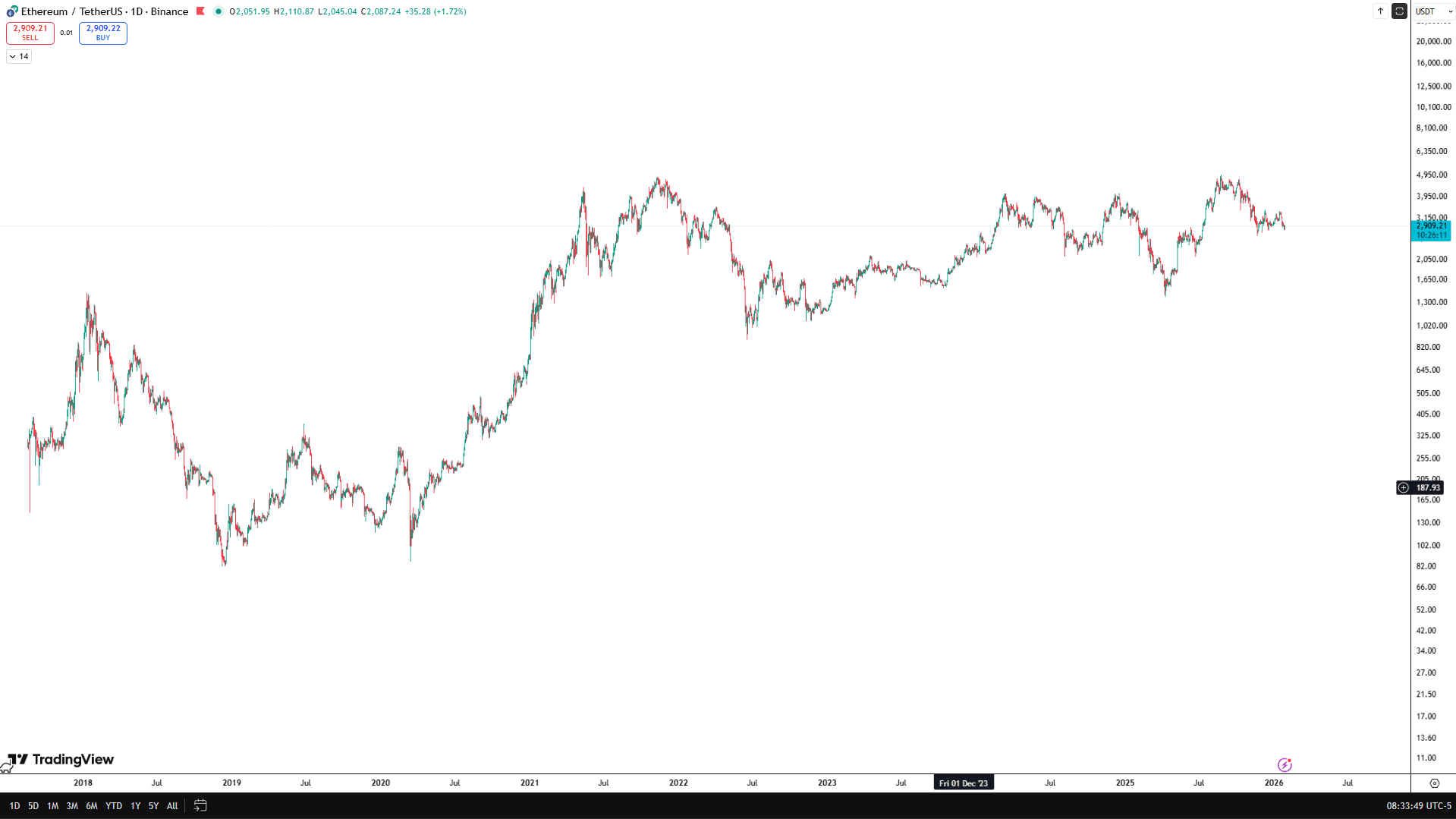 Ethereum price (ETH/USD, daily). After peaking near $4,900 in August 2025, ETH has retreated toward the $2,900–$3,000 range. Ethereum’s fundamentals remain robust, but its price action has been muted by cyclical headwinds. The network hosts the largest DeFi/NFT ecosystem and is core for stablecoin settlements; on-chain usage and developer activity are high. However, many investors have pointed out that Ethereum’s big upgrades (the Merge to PoS in 2022 and Shanghai withdrawals in 2023) are already priced in, and upcoming scaling (danksharding) is still years away. Meanwhile, ETF flows have exerted strong short-term pressure: as 99Bitcoins reports, spot-ETH funds saw heavy net outflows in January 2026 (over $600M in one week) coinciding with ETH’s 10–15% price slide. These redemptions amplify sell-pressure even as “whales” accumulate on dips.