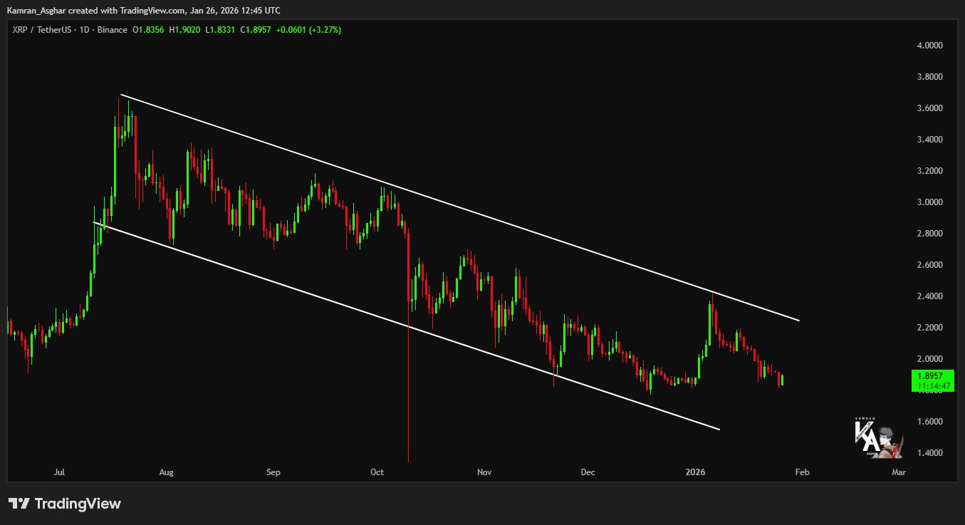 И обрати внимание на график, который у нас перед глазами, потому что изображение говорит больше, чем тысяча слов. Мы застряли в явно нисходящем канале с середины 2025 года. Цена подпрыгивала, как мячик для пинг-понга, между этими двумя верхними и нижними белыми уровнями. Прямо сейчас XRP борется в зоне $1.89, пытаясь оторваться от нижней части канала. Если присмотреться, мы недавно имели пик надежды, который столкнулся с верхним сопротивлением и вернул нас обратно к реальности. Но вот что интересно: этот RSI на уровне 35.98 говорит нам, что монета была "подарком" или перепродана. Это тот момент, когда охотники за выгодными предложениями бросаются в бой.