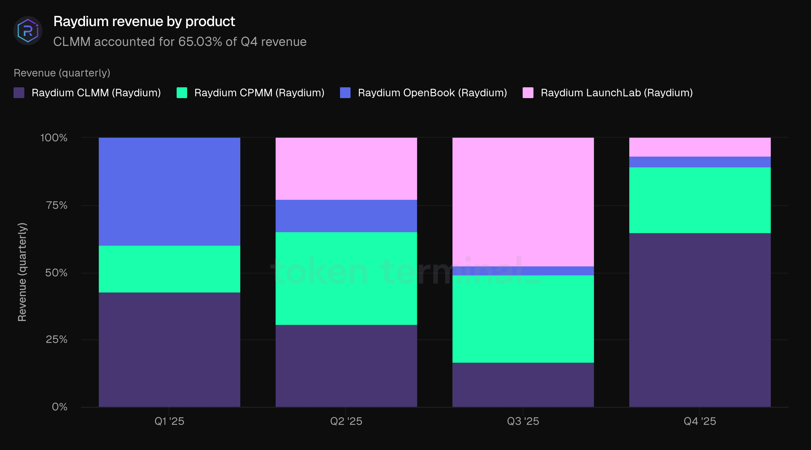 Доход измеряет общую стоимость торговых сборов в долларах США, удерживаемых Raydium после компенсации поставщиков ликвидности. Доход Q4 составил 4,85 миллиона долларов, что на 80,65% меньше, чем в Q3 (25,06 миллиона долларов), и на 87,45% меньше, чем в Q4 2024 года (38,66 миллиона долларов). CLMM был крупнейшим вкладчиком, составив 65,03% от дохода Q4, за ним следовали CPMM с 24,37%, LaunchLab с 6,77% и OpenBook с 3,82%. LaunchLab снизился на 97,24% по сравнению с предыдущим кварталом, в то время как CLMM снизился на 24,74% по сравнению с предыдущим кварталом.