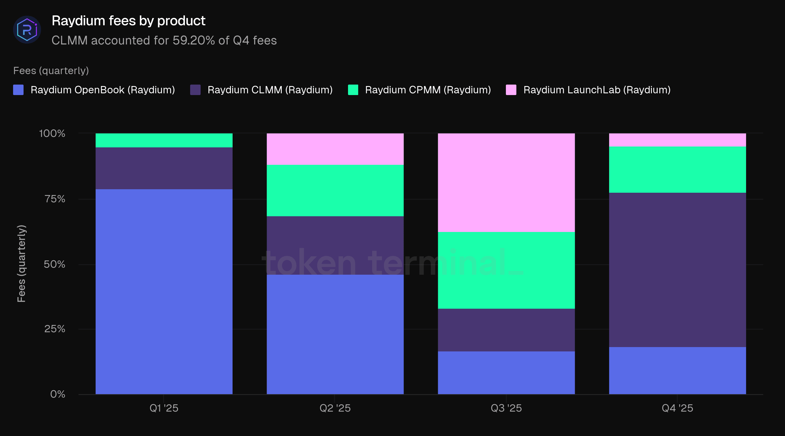 Сборы измеряют общую стоимость сборов в долларах США, уплаченных пользователями через торговые продукты Raydium. Сборы Q4 составили 33,31 миллиона долларов, что на 79,03% меньше, чем в Q3 (158,89 миллиона долларов), и на 95,48% меньше, чем в Q4 2024 года (737,54 миллиона долларов). CLMM составил 59,20% от сборов Q4, за ним следовали OpenBook с 18,56%, CPMM с 17,43% и LaunchLab с 4,81%.