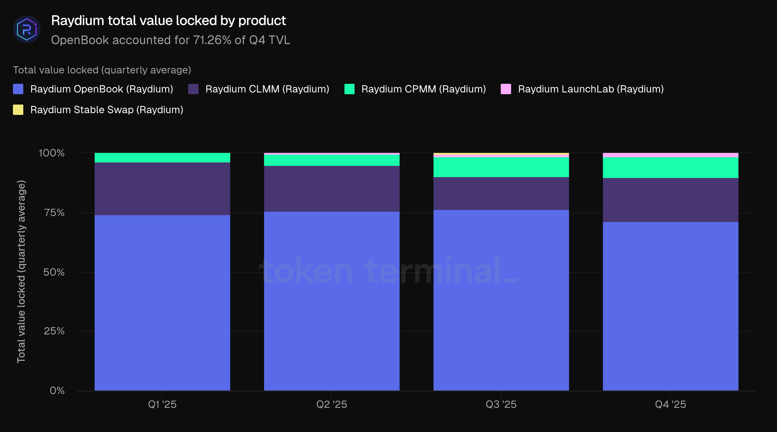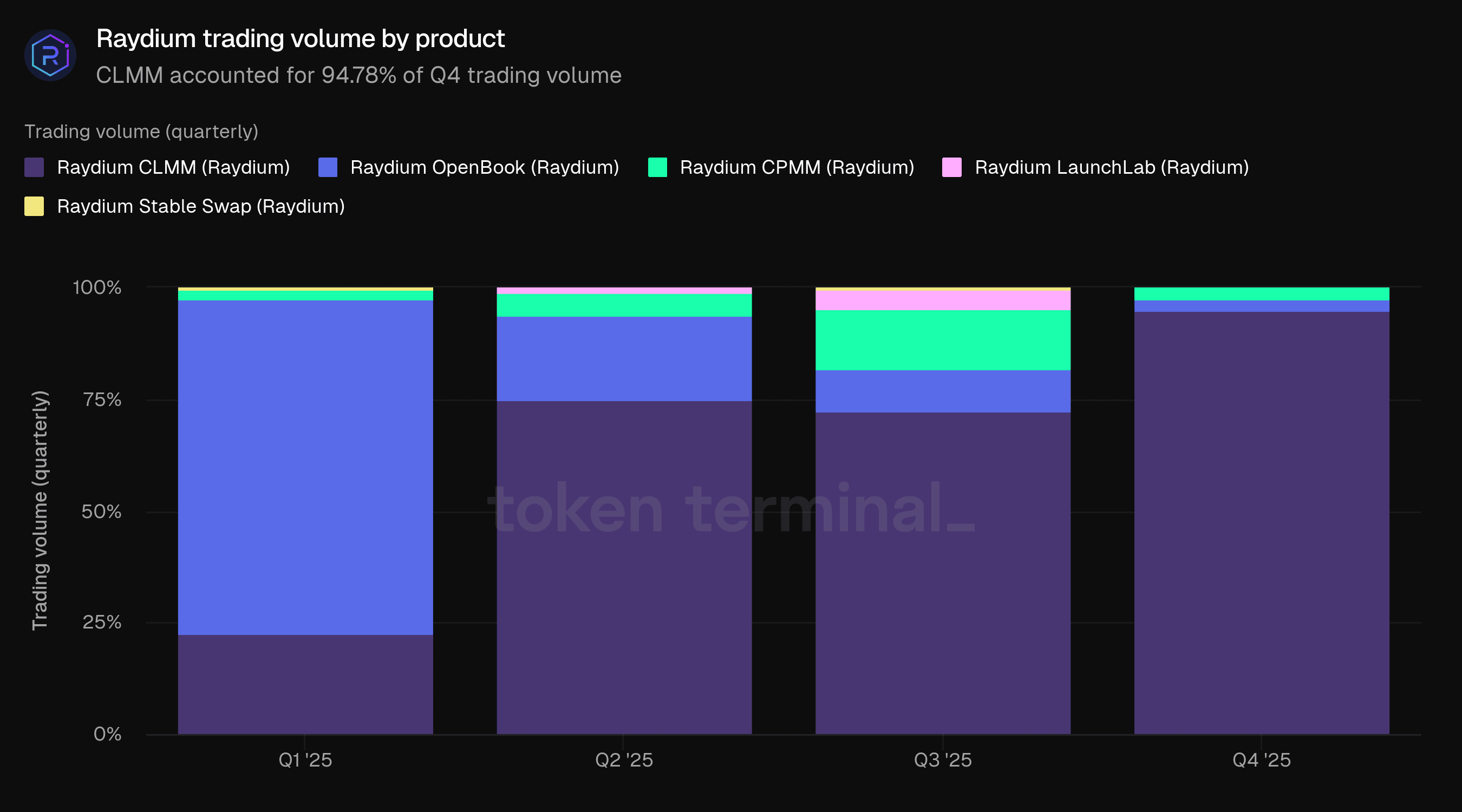 Несмотря на снижение, Raydium укрепил свою позицию в экосистеме DEX Solana, увеличив свою рыночную долю объема торговли до более чем 50%. Пулы CLMM продолжили доминировать в торговой активности, представляя почти 95% объема Q4, при этом удерживая только 18% от TVL, что демонстрирует сильную капиталовложение.