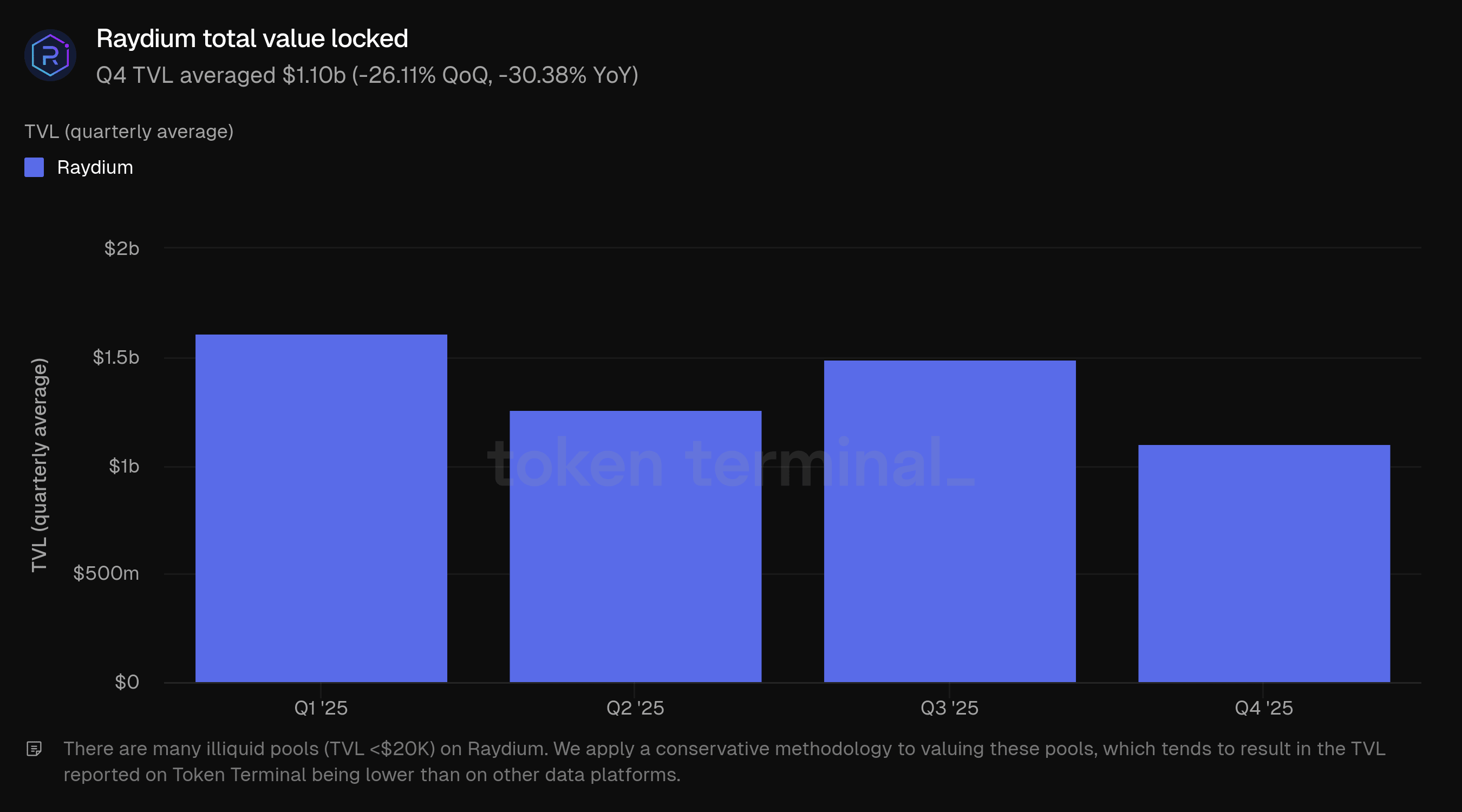"Raydium закрыл Q4 2025 со средним TVL в 1,10 миллиарда долларов, что отражает влияние подавленных цен на SOL, а не какую-либо фундаментальную изменение доверия пользователей или глубины ликвидности. В терминах SOL TVL оставался здоровым на протяжении всего квартала, демонстрируя, что поставщики ликвидности продолжают доверять Raydium как своему основному месту на Solana.