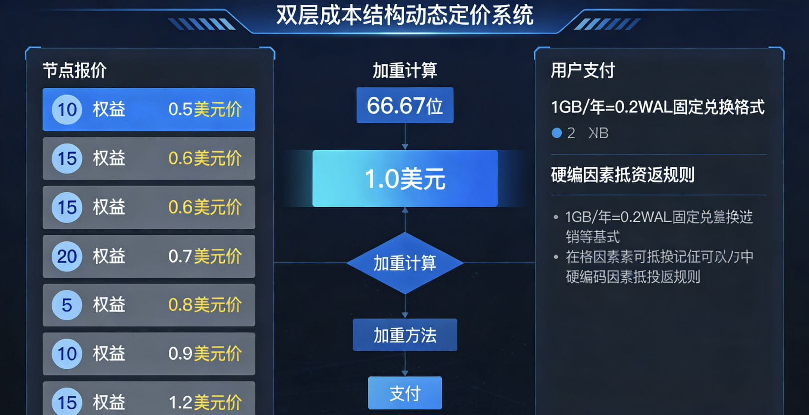 在实际的生态操作中,WAL作为存储支付媒介的定价机制,让我看到了项目方的专业和严谨,它不是固定的汇率定价,而是采用了市场驱动的双层成本结构,这种方式既避免了节点的价格垄断,又能让存储价格始终贴合市场的实际需求。我实际操作过Walrus的存储定价流程,节点会根据自己的运营成本提交存储报价,系统会按照节点的质押权益进行加权,最终选取66.67个百分位数的报价作为全网的统一存储价格,举个实际的例子,如果6个节点分别以10/15/20/5的权益报价0.5美元、0.5美元、0.9美元、1.0美元、1.0美元、1.2美元,那么最终的全网存储价格就是1.0美元,而这个价格会以WAL的形式进行结算,1GB/年的存储费用固定为0.2个WAL,不受代币价格波动的影响。这种设计让用户的存储成本始终保持稳定,哪怕WAL的市场价格出现波动,用户的实际存储成本也不会变化,这对于企业级用户来说尤为重要。我还发现,Walrus在写入成本的计算中加入了“硬编码因子”,用户在上传数据时需要支付额外的押金,而如果用户将数据存储在更多的节点上,这笔押金会被返还,这种机制激励了用户的多节点存储行为,进一步提升了网络的数据可用性,而用户为了获得押金返利,会更愿意使用WAL完成整个支付流程,这也让WAL的支付场景得到了进一步的拓展。