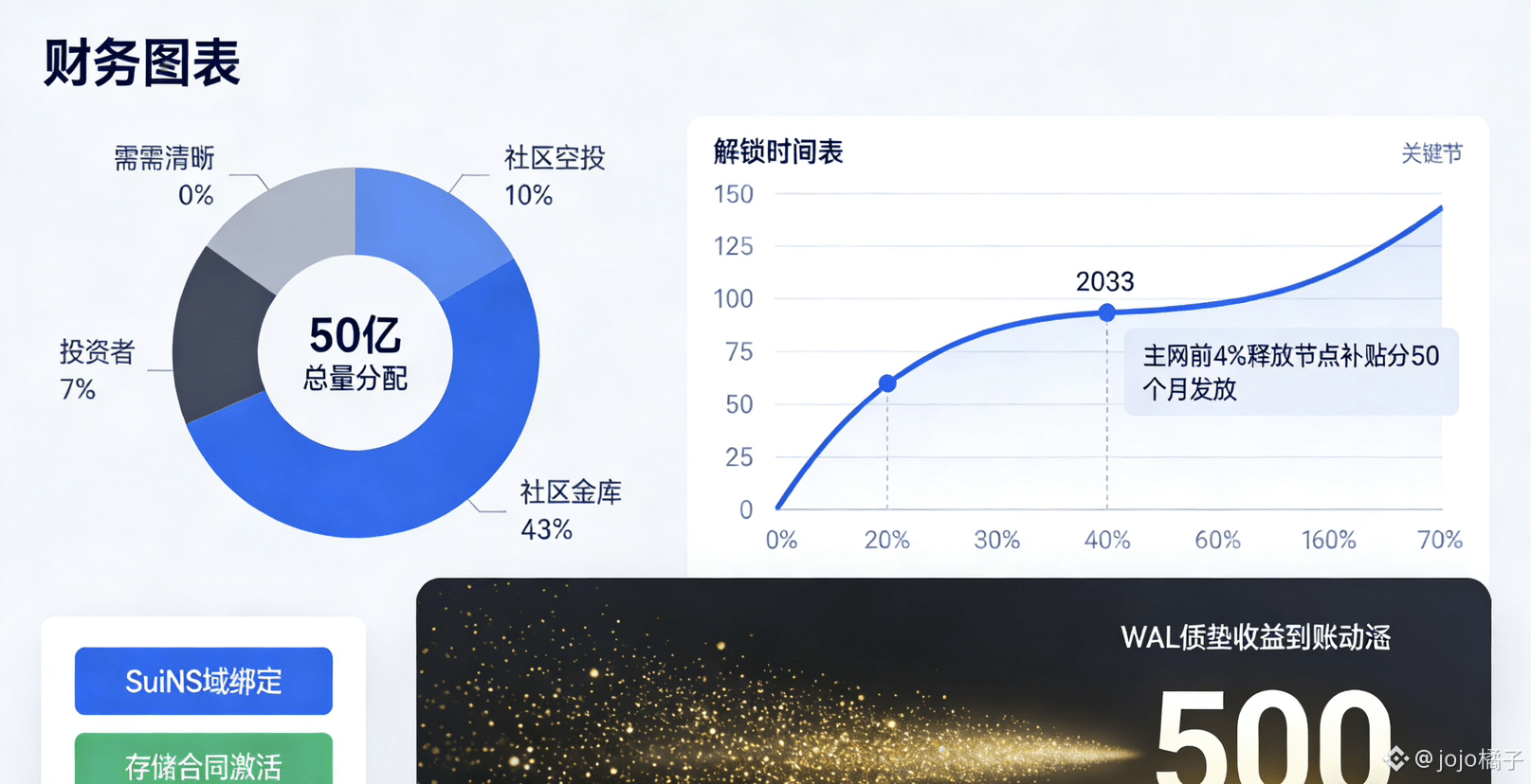 我接触WAL代币的初衷,是想搞清楚去中心化存储项目的代币经济模型该如何和实际应用结合,毕竟很多项目的代币设计看似合理,却始终无法落地,而Walrus的WAL代币,却让我看到了“经济模型服务于生态,生态反哺代币价值”的完整闭环。研究完WAL的代币设计和实际的生态落地情况后,我发现这个代币的每一个分配比例、每一个应用场景,都是围绕着Walrus协议的存储需求来设计的,总供应量50亿的上限设定,以及社区优先的分配原则,让WAL从诞生之初就避免了过度通胀和筹码集中的问题,而在实际的生态操作中,WAL的支付、质押、治理三大功能,更是相互联动,让整个代币的流通形成了正向的循环。我仔细核算过WAL的代币分配方案,社区空投占比10%,这一比例甚至超过了投资者的7%,而且空投不是一次性发放,主网前只释放4%,剩下的6%需要通过质押行为逐步解锁,这种设计让真正参与网络的用户能获得更多的代币奖励,而不是让投机者一次性薅走福利。我身边有不少Sui生态的老用户,通过绑定SuiNS域、激活存储合约拿到了空投的WAL,并且进行了质押,不仅解锁了剩余的代币,还获得了稳定的质押收益,这种设计让WAL的初始流通筹码牢牢掌握在社区手中,也为后续的生态发展奠定了坚实的用户基础。