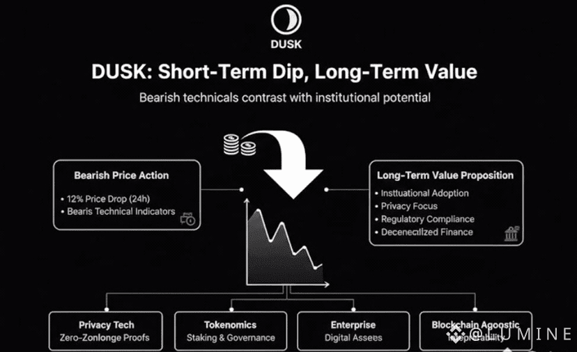 In the ever volatile world of digital assets, price movements often tell only part of the story. Over the past 24 hours, DUSK has experienced a notable pullback a sharp 12% decline that has caught the attention of traders, analysts, and long term believers alike. On the surface, the market narrative appears bearish, reinforced by technical indicators flashing red. Yet beneath this short-term turbulence lies a fundamentally different picture one rooted in institutional relevance, regulatory alignment, and long-horizon value creation.
