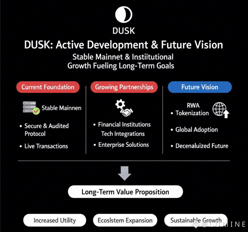 Long-term visions require foundations that can scale not just technically, but institutionally. DUSK’s combination of a stable mainnet and active development ensures the network can evolve alongside regulatory changes, market demands, and technological innovation.
