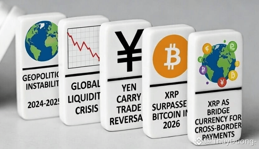 Các chuyên gia như Jake Claver (XRP Domino Theory) cho rằng sự bất ổn địa chính trị, khủng hoảng thanh khoản toàn cầu và đảo ngược carry trade yên Nhật sẽ tạo hiệu ứng domino. Khi dòng tiền truyền thống bị siết chặt, nhà đầu tư sẽ chuyển sang các tài sản có utility thực tế cao như XRP – với tốc độ giao dịch 3-5 giây, phí thấp và vai trò cầu nối thanh toán xuyên biên giới.