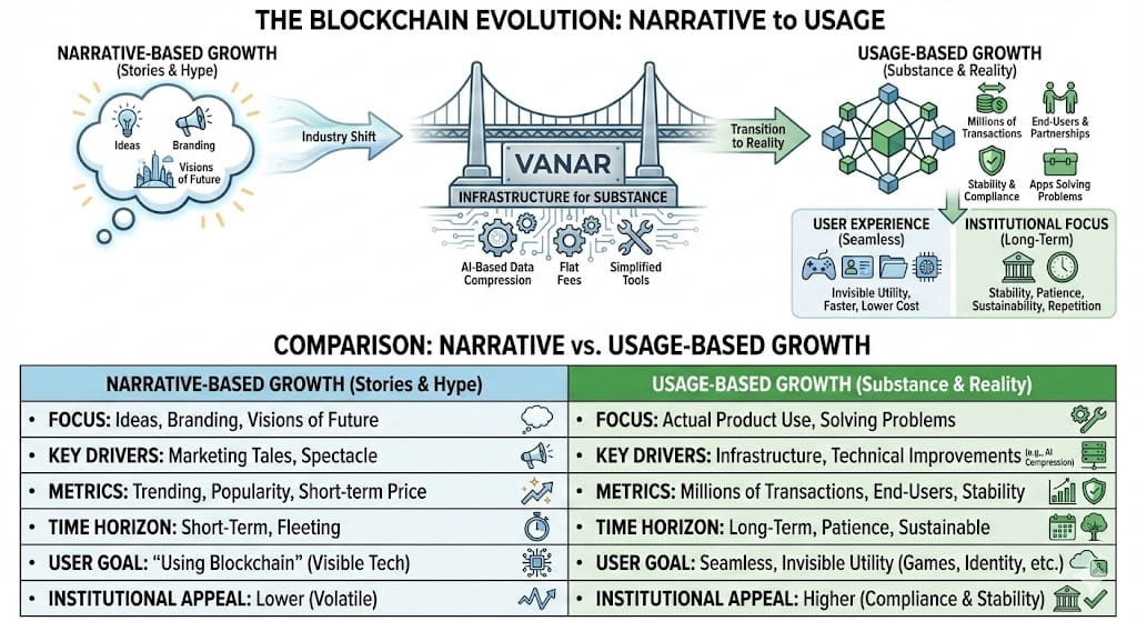 Проще говоря, рост, основанный на нарративе, зависит от идей, брендов и будущих видений. Рост, основанный на использовании, с другой стороны, зависит от пользователей, использующих продукт. Хотя это звучит незначительно, это огромная разница. Если блокчейн используется миллионами пользователей, имеет миллионы транзакций и приложения, используемые для решения реальных проблем, он становится бизнесом с реальной ценностью. Недавнее направление развития Vanar говорит о таком мышлении. Вместо того чтобы сильно сосредотачиваться на маркетинговых историях, он активно инвестирует в инфраструктуру для поддержки пользователей и повседневного использования, такую как сжатие данных на основе ИИ, фиксированные транзакционные сборы и инструменты для автоматизации сложности.