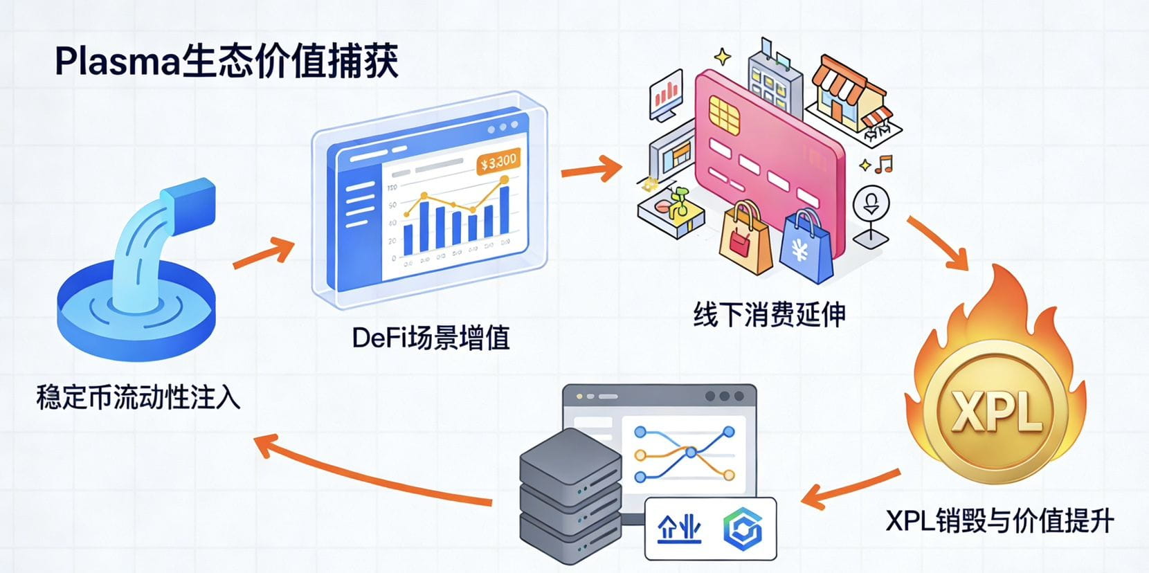 Plasma XPL的核心价值,并非单一的零手续费支付功能,而是通过底层架构、代币经济、生态场景的深度融合,打造了一套稳定币经济的生态飞轮:零摩擦支付吸引稳定币流动性注入→流动性提升带动生态应用与真实场景落地→场景落地推动网络活跃度与复杂交易增加→复杂交易实现XPL的价值捕获与通缩→XPL的价值提升进一步支撑网络安全与生态补贴→生态补贴持续吸引更多稳定币与用户加入。