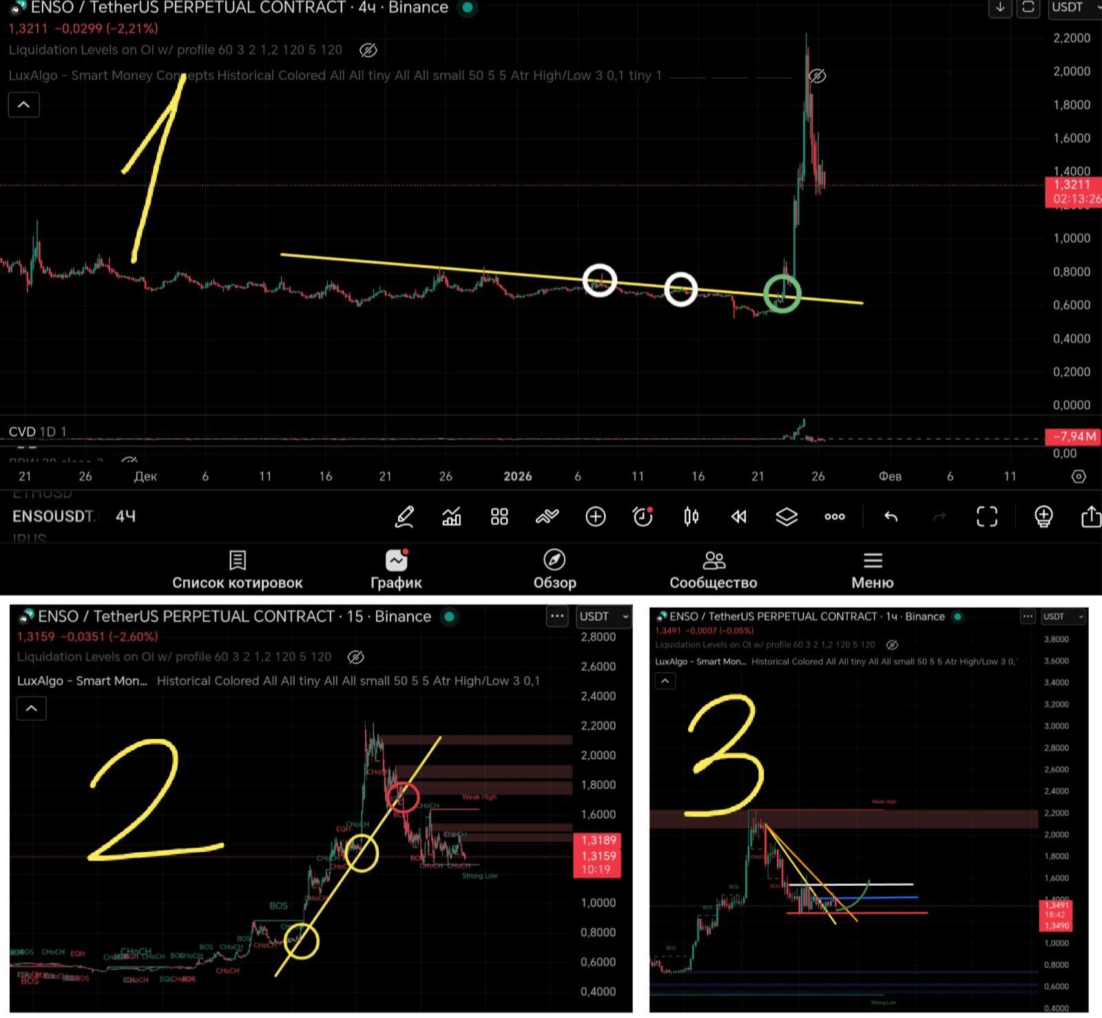 Первое 📸фото из блока: Таймфрейм 4 часа, опорные точки в жёлтых кругах.