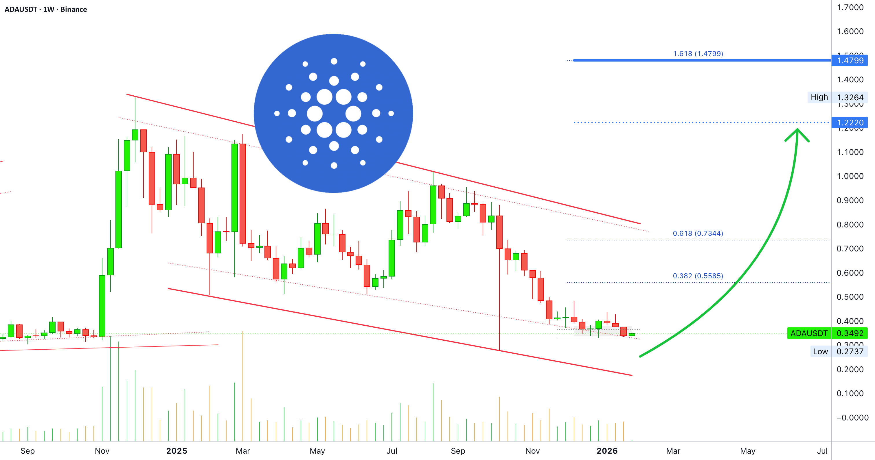 Cardano находится в такой же ситуации, как Dogecoin, о которой я говорил с вами всего несколько минут назад. Действие происходит на минимальных ценах в течение нескольких месяцев, на самом низком уровне с ноября 2024 года на основе закрытия свечей. Поистине, минимальные цены.