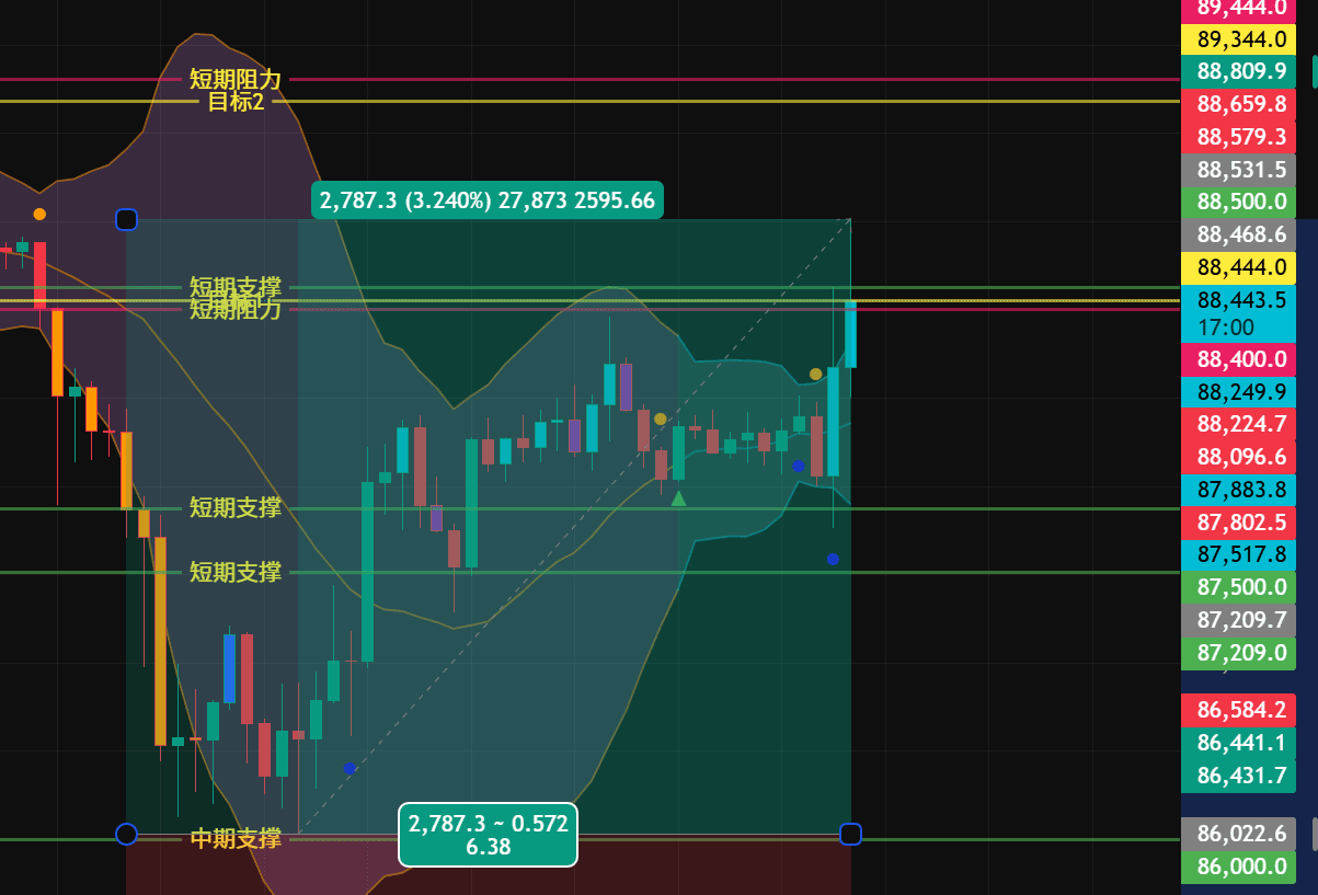 88,200 - 88,400:即时支撑(顶底转换)。刚刚突破的阻力位,现在变成了“地板”。回踩不破这里,就是极强走势。