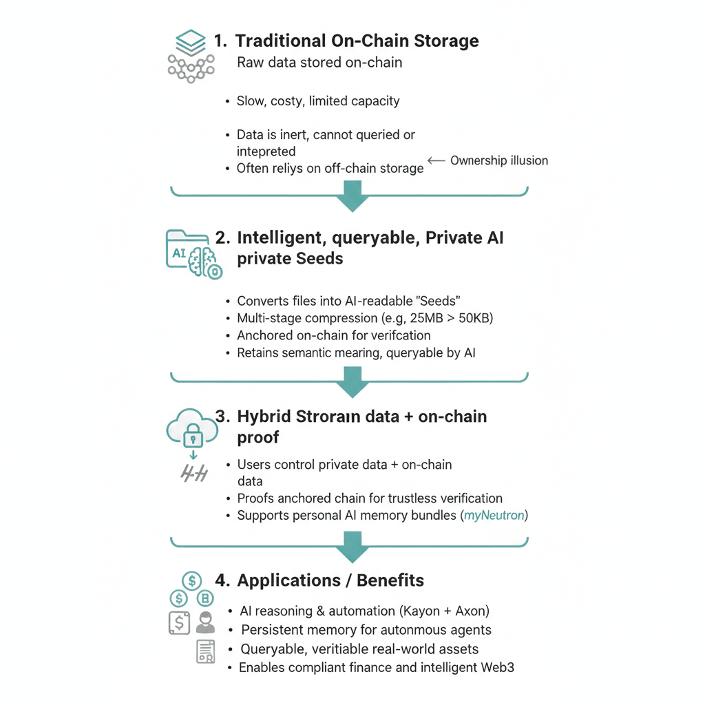 В течение многих лет индустрия блокчейна сталкивалась с постоянным напряжением между безопасностью и практичностью. С одной стороны, хранение на цепи предлагает неизменность и проверяемое доверие; с другой стороны, оно медленно, дорого и ограничено по емкости. Это заставило разработчиков полагаться на решения вне цепи, от облачных серверов до децентрализованных сетей, таких как IPFS, создавая фрагментированные системы, где критические данные часто находятся за пределами доверительной границы блокчейна. Уровень Neutron от Vanar Chain предлагает революционное решение для этого долгосрочного компромисса. Вводя концепцию Частной AI Памяти, Vanar переходит от простого хранения данных к созданию интеллектуальных, запрашиваемых и приватных объектов знаний, которые существуют нативно в экосистеме блокчейна. Это представляет собой глубокий сдвиг в том, как данные могут храниться, получать доступ и использоваться в Web3.