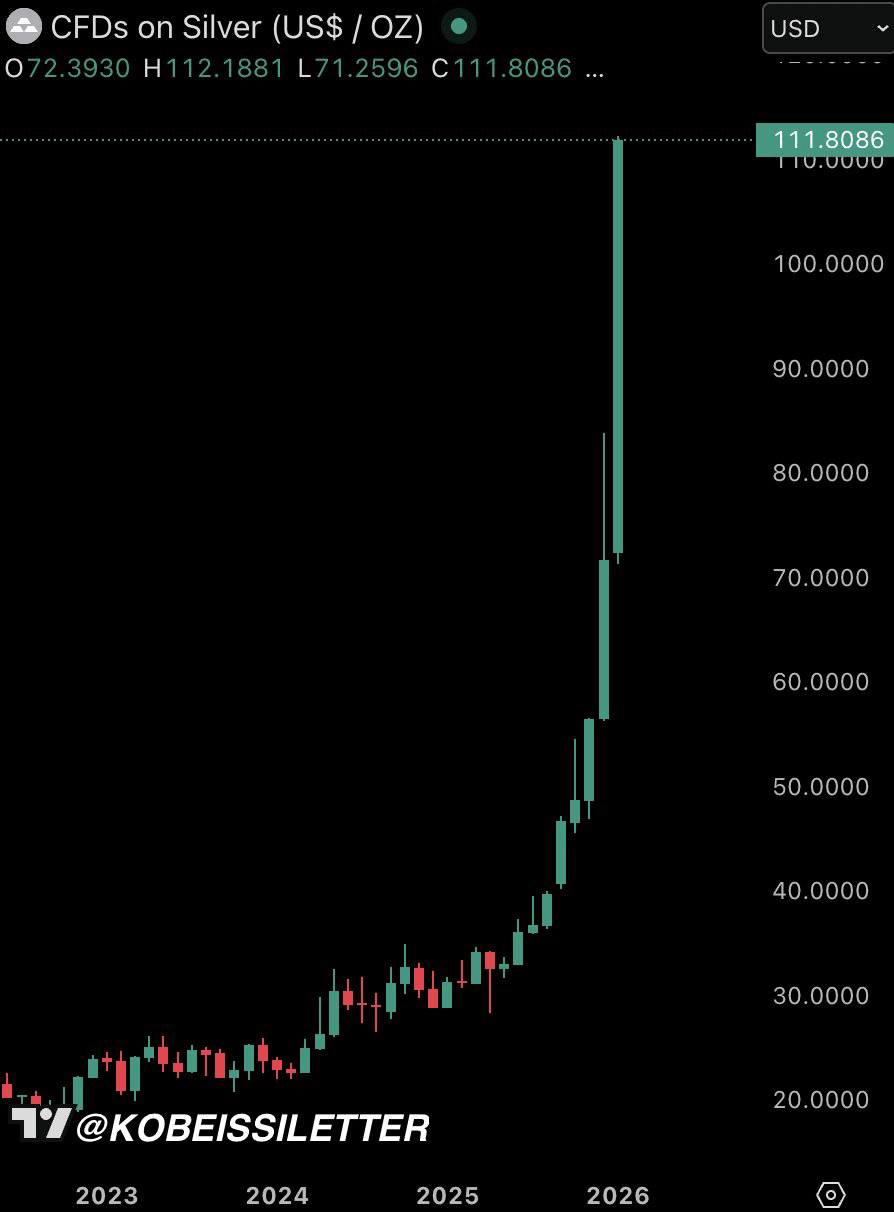 Один взгляд на этот график свечей, и вы можете почувствовать это мгновенно: рынок не спрашивает разрешения, прежде чем двигаться. Серебро (CFD) резко поднялось в зону ~$112/унция, преодолев исторические максимумы с "лифтевым движением", а не медленной лестницей. После долгого периода бокового движения вокруг $20–$35 цена начала расти, затем перешла в ускорение и, наконец, взорвалась в почти вертикальный ралли с последовательными огромными зелеными свечами. Это классический переход: длительное накопление, прорыв, расширение импульса, затем полное зажигание.