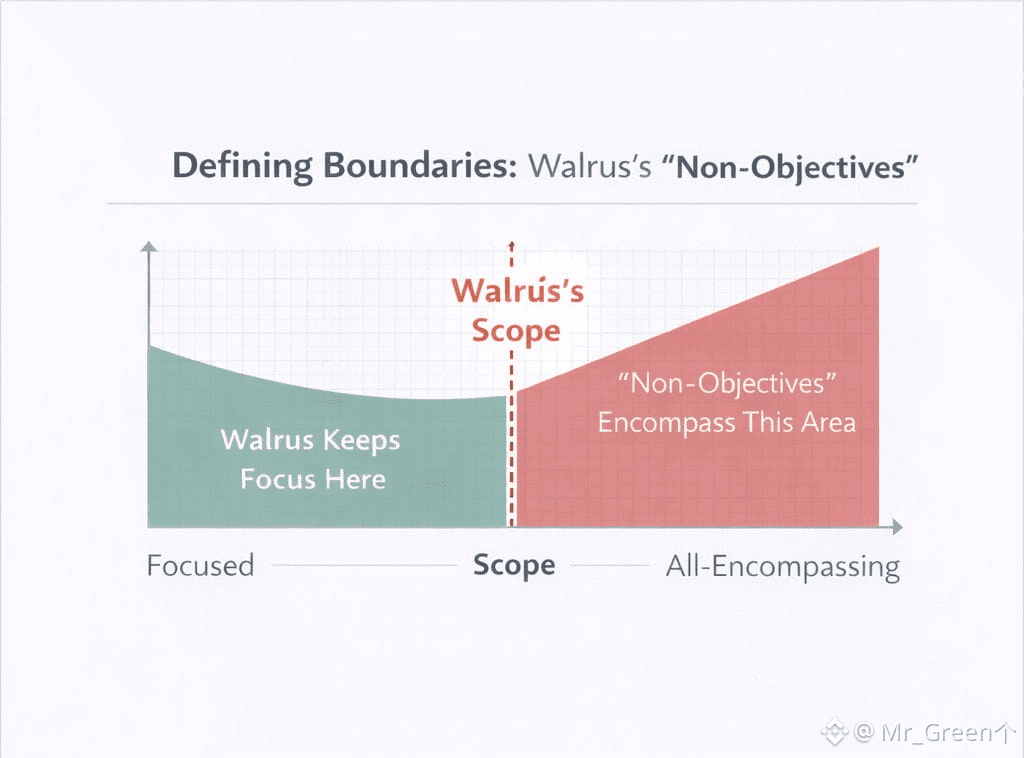 In Web3, projects often lose trust for a simple reason. They promise to replace too many things at once. They try to be storage, execution, identity, CDN, and governance all in one. The result is usually a system that looks impressive on paper but struggles in real life because it cannot be excellent at the basics. Walrus takes a more restrained approach. It is very explicit about what it is trying to do, and also what it is not trying to do. These “non-objectives” are not marketing disclaimers. They are design boundaries that protect reliability.