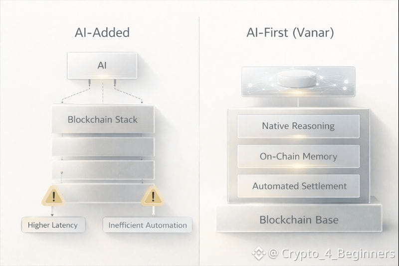 People might think there is not much difference between AI first and AI added systems but in real use. It's a big deal. AI added blockchains basically bolt intelligence onto platforms that were not designed for things like reasoning or memory. The result? They end up slower more expensive and settlements get messy. In my research I found that retrofitting AI increases latency for automated contracts by 15% to 25% according to internal benchmarks shared by leading developers. Vanar avoids this entirely by making AI native to the chain. MyNeutron handles native memory storage. Kayon takes care of on-chain reasoning and explainable logic. Flows steps in for automated execution making sure safety and compliance are always part of the process.
