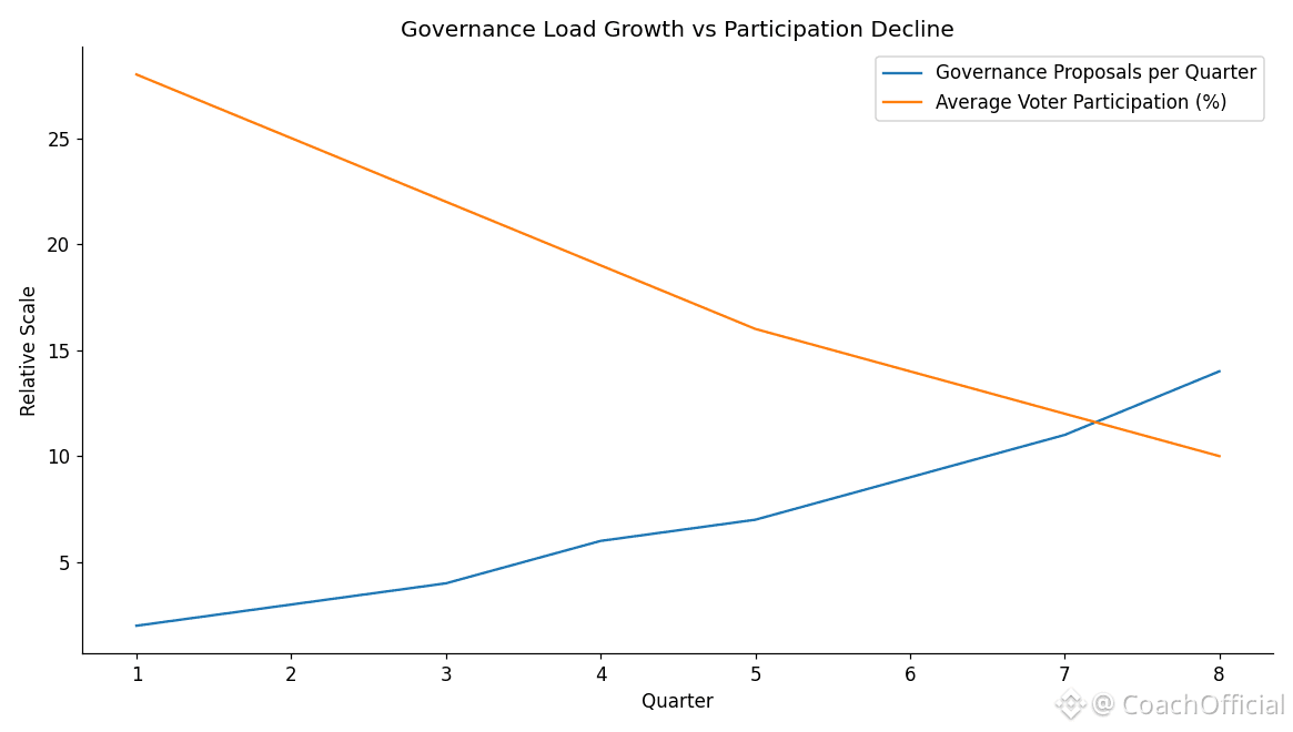 That’s the recurring problem here. Governance sounds powerful, but most holders treat it like background noise. Tokens get staked, rewards roll in, and proposals scroll by untouched. Over time, decisions end up made by whoever bothers to show up, not necessarily whoever understands the risks best. The result isn’t dramatic at first. It shows up as slow fixes, rushed upgrades, or parameters that favor short-term incentives over long-term stability. On chains built for finance, where privacy and compliance overlap, low participation raises the stakes. A poorly reviewed proposal doesn’t just tweak fees. It can affect data exposure, settlement behavior, or regulatory posture in ways that are hard to undo.