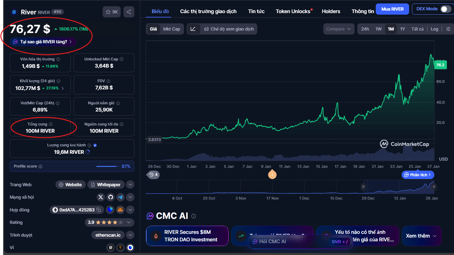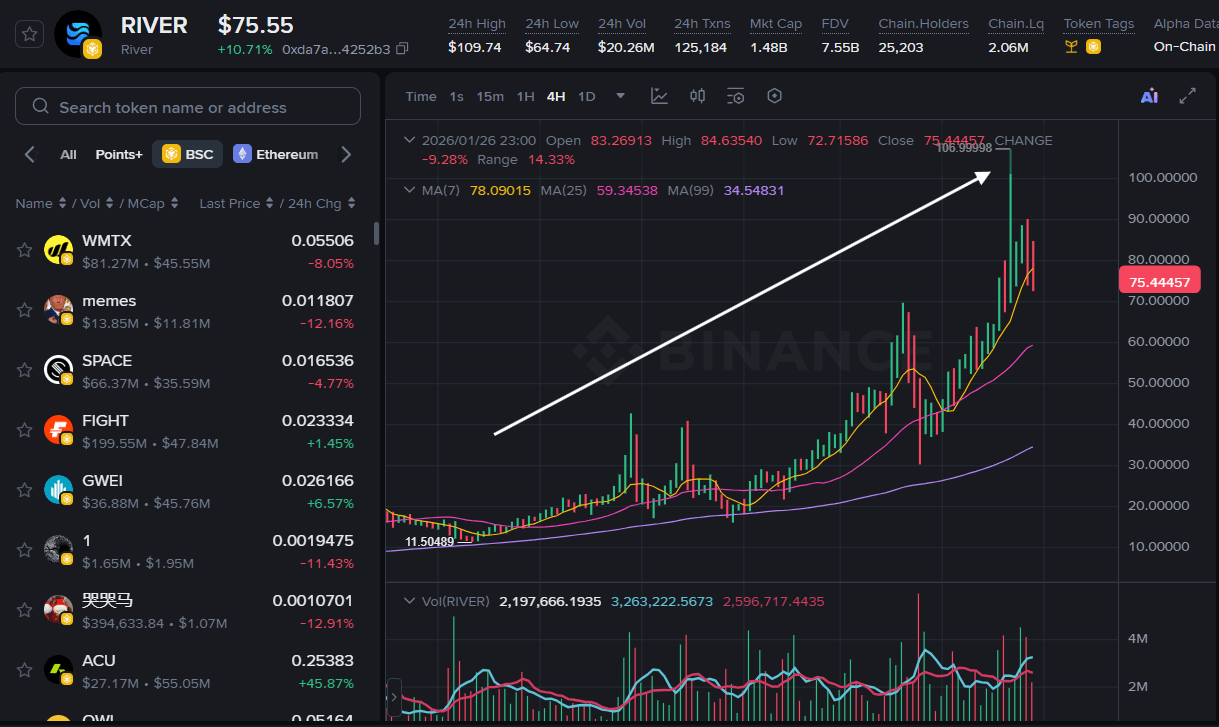 Когда $RIVER был запущен, это выглядело как просто еще один "обещающий" токен на рынке, полном обещаний. Низкая цена. Скромный объем. Наратив, который звучал технически, даже скучно. Перемотаем на несколько месяцев вперед — и RIVER вырос более чем на 155% за одну неделю, торгуясь около 84 долларов, с рыночной капитализацией 1,6 миллиарда долларов.