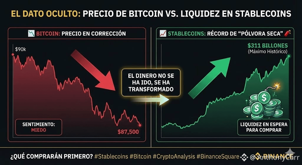 El capital en Stablecoins ha alcanzado los $311,000 millones hoy. Esto nos dice que los inversores NO están abandonando el barco. Se están quedando en el muelle (en USDT/USDC) esperando el momento exacto para volver a subir. Hay más dinero listo para comprar ahora que en cualquier otro momento del año.
