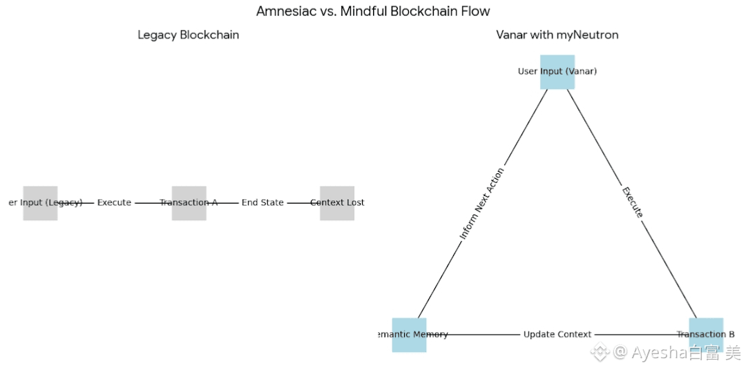 Vanar has taken a radically different approach by building what we might call a nervous system into the blockchain itself. Through its myNeutron layer, the network possesses semantic memory. Returning to our analogy, using Vanar is like finally meeting a financial advisor who not only remembers your name but recalls the conversation you had three months ago, understands your risk tolerance, and knows exactly how today’s decision fits into your five-year plan. This context is vital because AI agents require data continuity to function effectively. They cannot operate in a vacuum. By embedding this memory directly into the infrastructure, Vanar allows agents to retain their "thought process" on-chain, transforming the network from a simple ledger of cold numbers into a dynamic environment of context and reasoning.