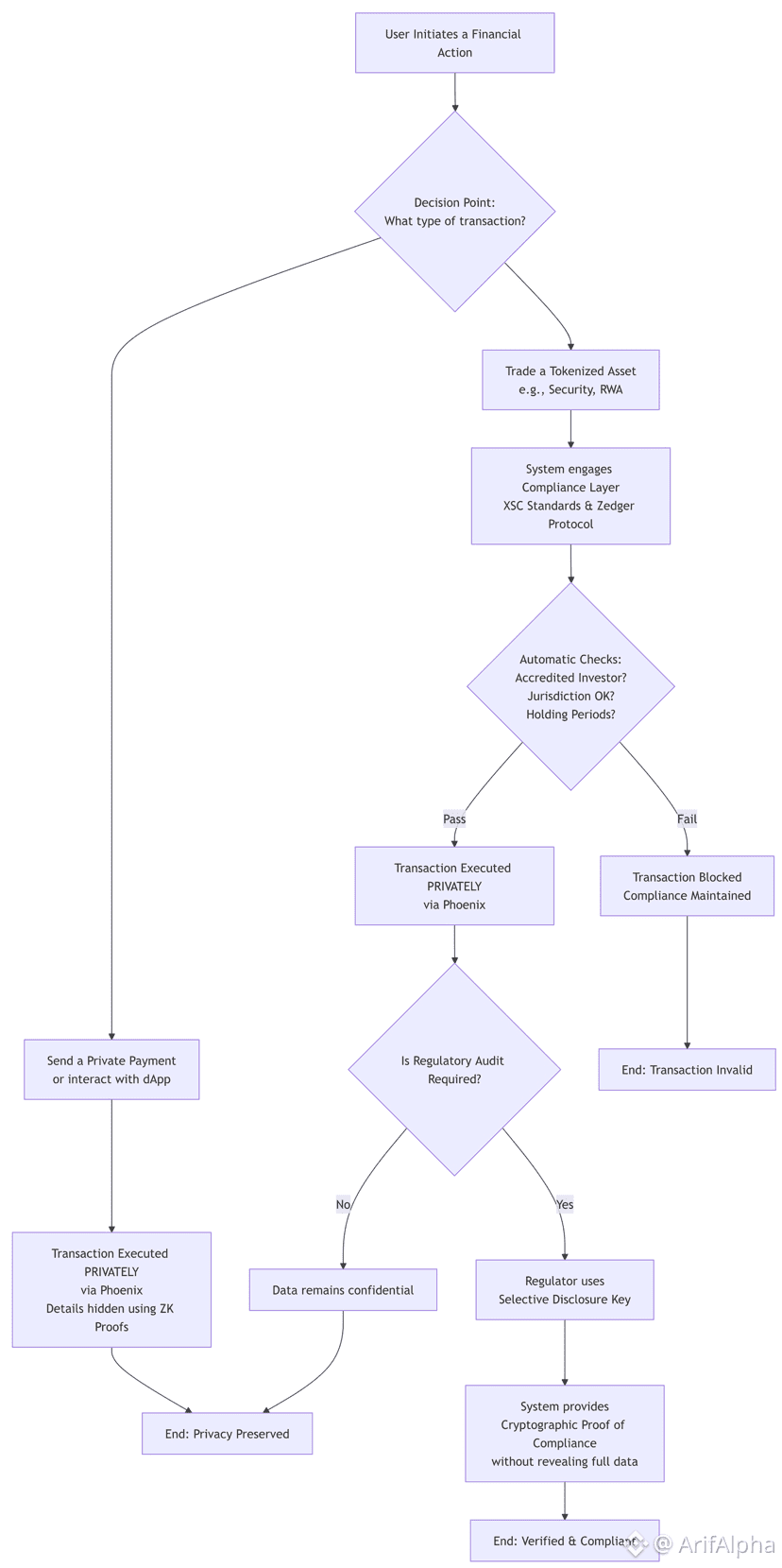 As this user flow illustrates, the DUSK protocol acts as a context-aware financial router. It intelligently directs actions down the appropriate path—automatically engaging on-chain compliance primitives for regulated assets or executing pure privacy for private transfers—all while preserving a verifiable audit trail for authorized parties.