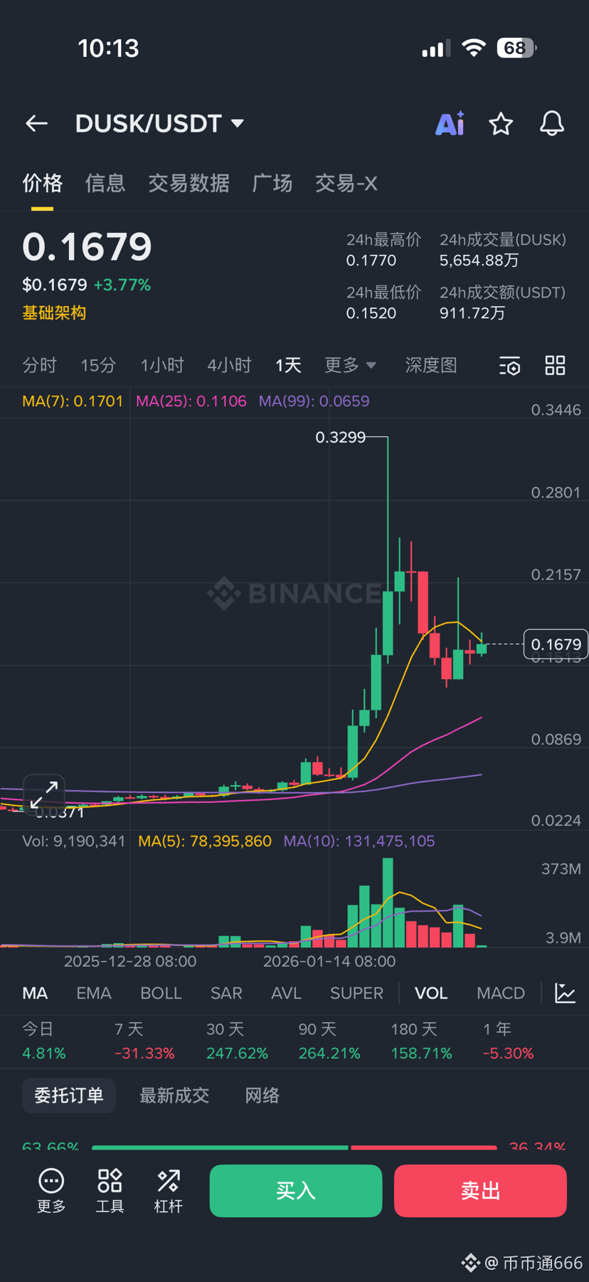 2026年开年没几天,Dusk Network@Dusk 就把主网彻底激活了。1月7日那天,官方低调宣布从测试阶段跳到正式Layer-1,带着六年磨出来的隐私+合规架构直接上线。DuskEVM兼容Solidity,Hedger模块让零知识交易既保密又能给监管方留审计窗口,这套组合在隐私币里算独一份。没过几天,价格就跟坐火箭似的,从0.05美元附近直冲0.26美元,涨幅一度超400%,交易量也跟着爆棚。市场突然记起还有这么一条“听话的隐私链”,资金从Monero、Dash那边轮动过来,DUSK成了1月中下旬最亮的那个。