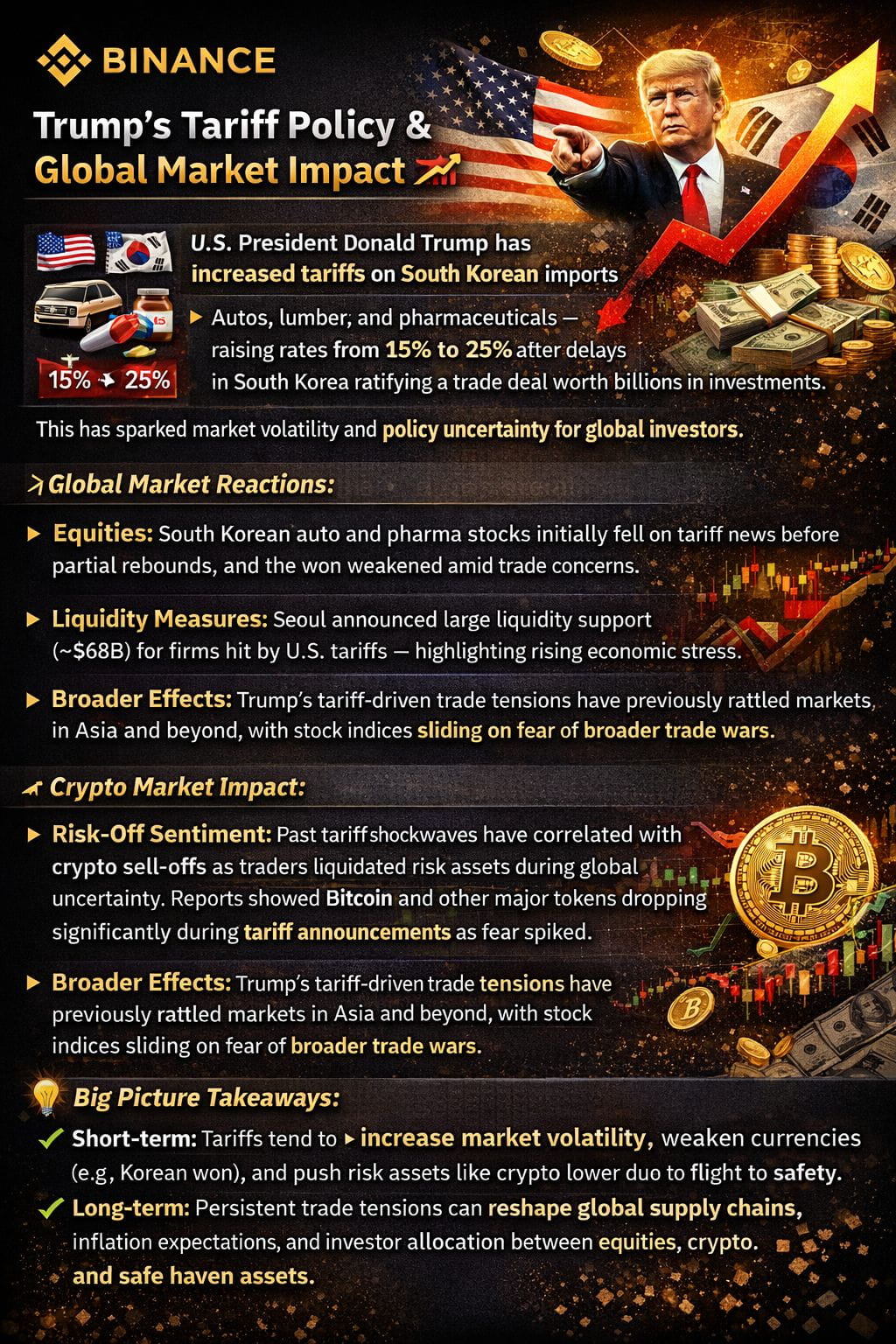 ✅ **Short-term:** Tariffs tend to *increase market volatility*, weaken currencies (e.g., Korean won), and push risk assets like crypto lower due to *flight to safety*.