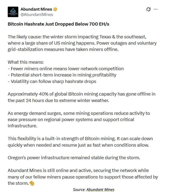Хешрейт биткойна только что упал ниже 700 EH/s. Это не мало. Это большой кусок майнеров, отключившихся, в основном из США, особенно Техаса и юго-востока, потому что зимние штормы отключили электричество и заставили майнеров остановиться, чтобы защитить сеть.