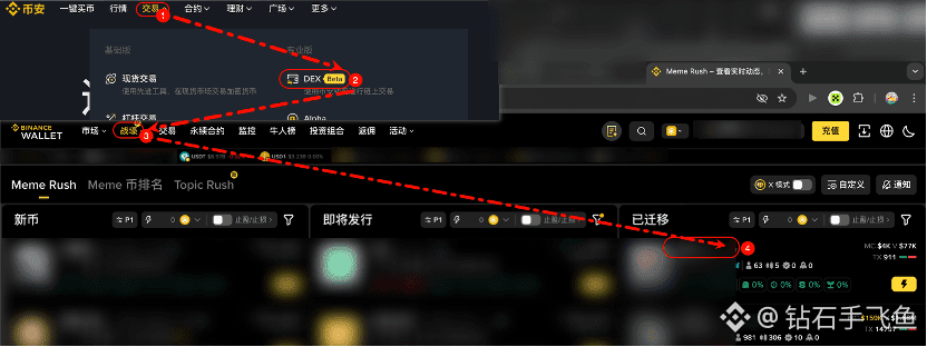 抵达战壕的路径以币安钱包网页版为例,从币安交易所点击交易—DEX—战壕(新币极容易归零,建议新手朋友从已迁移一栏代币中选择购买)。