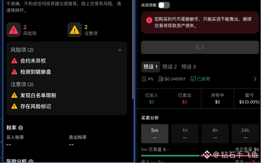 指能够买入不能够卖出,或者卖出税率为100%的代币,这类代币买入那一刻,就完成了学费的缴纳。