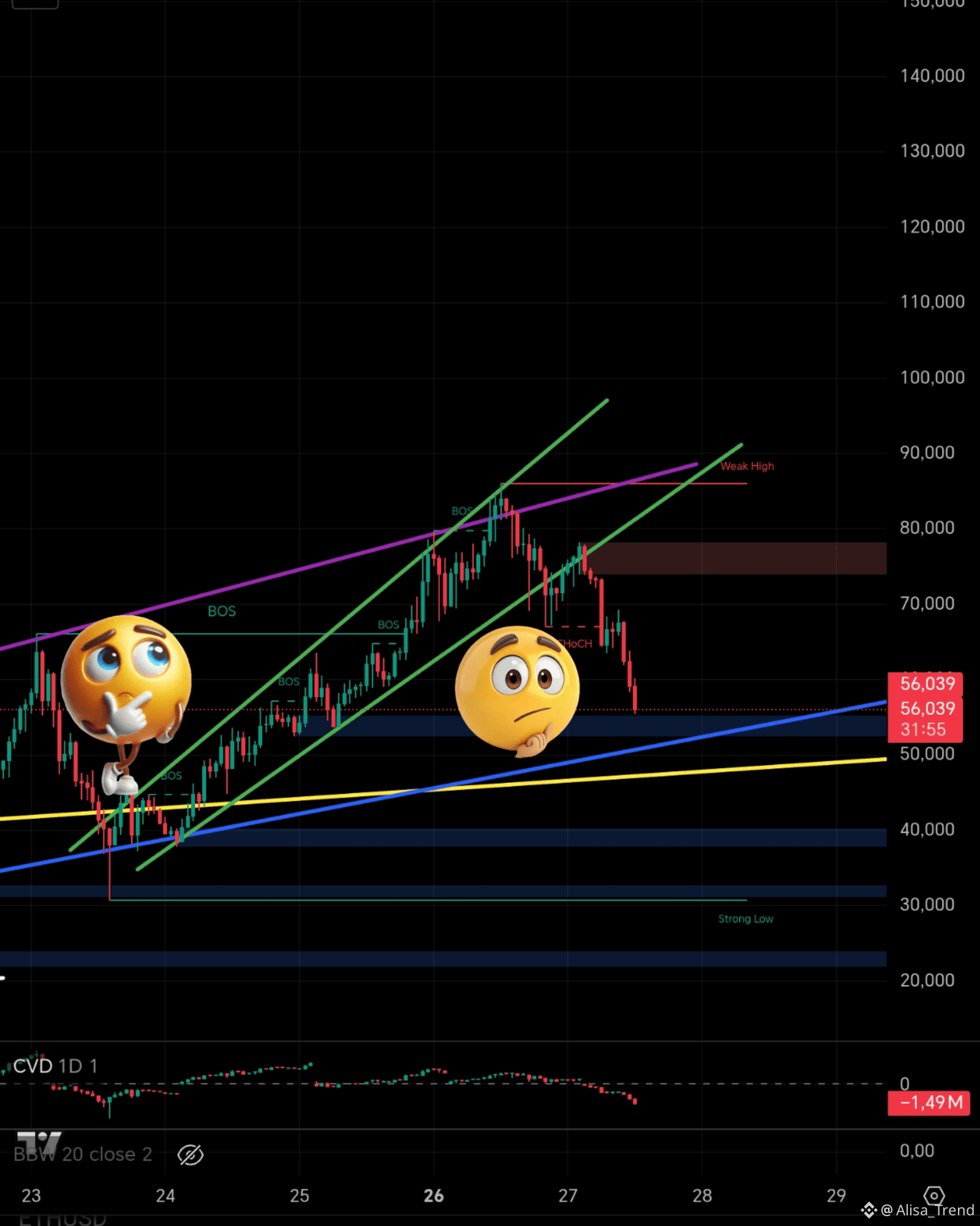 Так что, пока всё по плану👍 План пока такой😂 Если спустится и закрепится ниже линии поддержки, то шорты продолжают радоваться, а лонги ищут новый вход в монету🙂