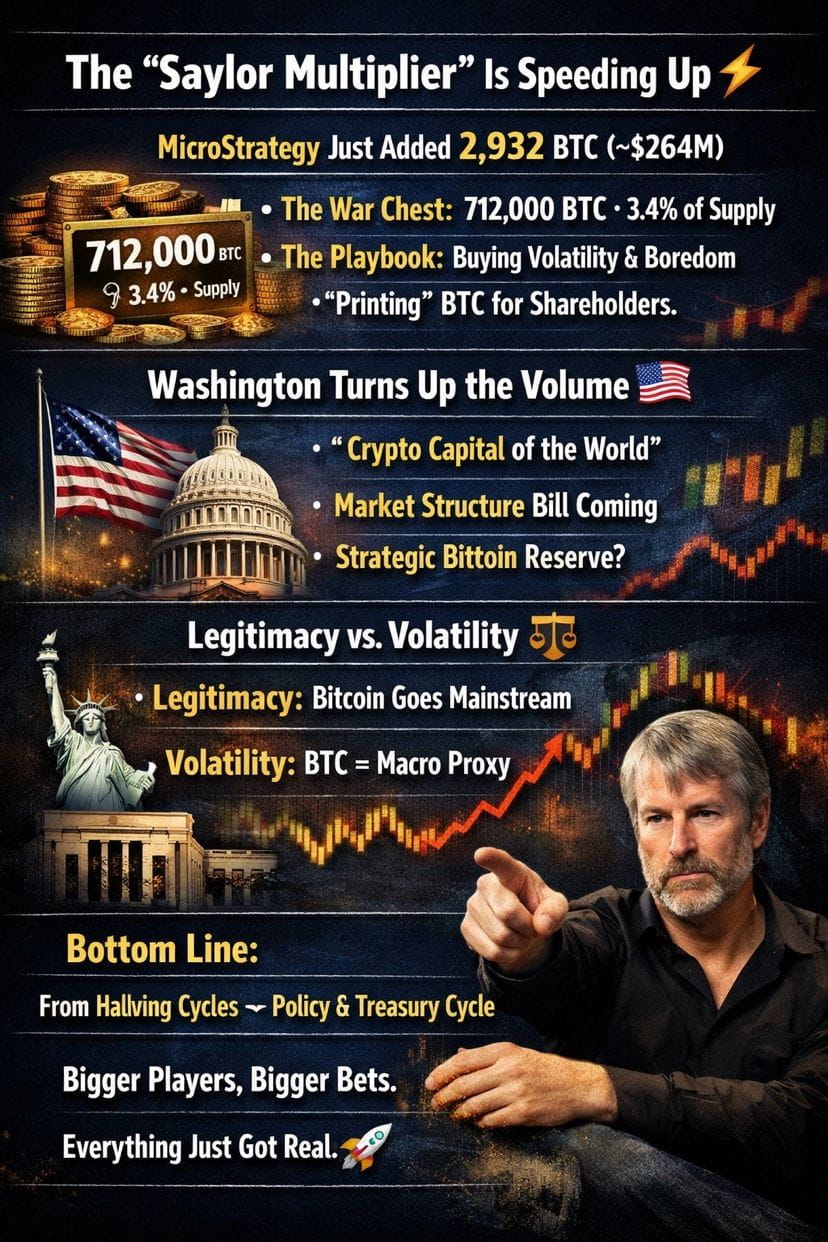 • The Playbook: Saylor isn’t timing dips anymore. He’s buying volatility and boredom. By funding purchases through MSTR equity and preferred stock, he’s effectively manufacturing Bitcoin exposure for shareholders. It’s a self reinforcing loop the market still hasn’t fully priced in.