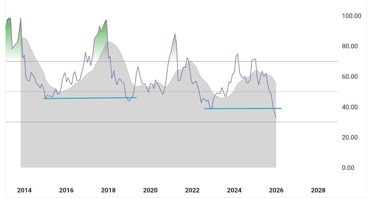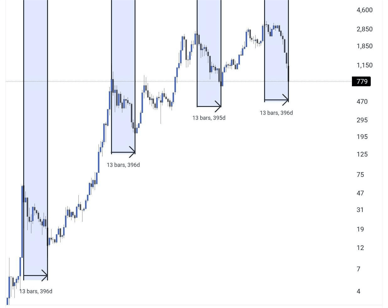 В прошлых циклах его нисходящий тренд достигал дна после ~13 месяцев.