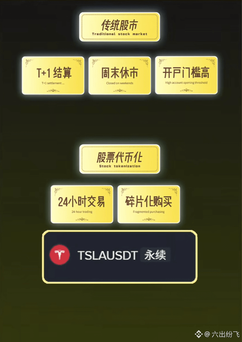 为什么大家都要抢着股票代币化?因为传统股市太过落后,T+1结算,周末休市,开户门槛高,而股票代币化,24小时交易,还可以碎片化购买。
