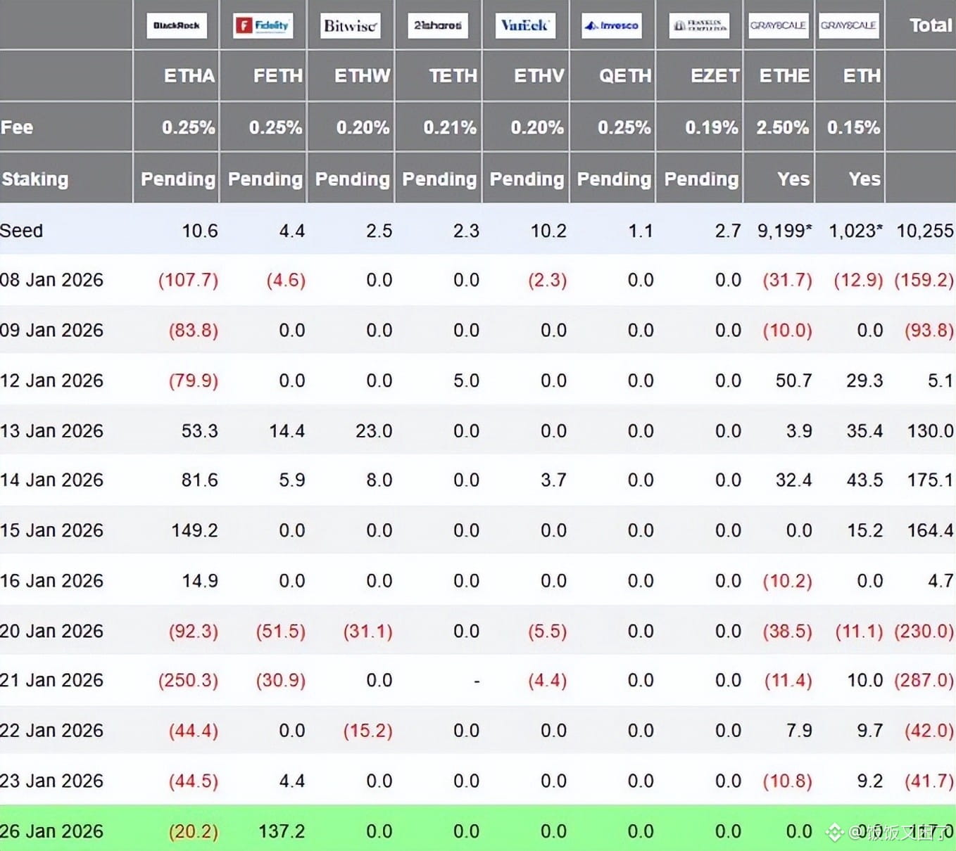 1月26日的ETF资金流入显示,以太坊仍具备机构关注度。富达基金吸收了大部分资金,而贝莱德出现流出,反映出机构的选择性建仓策略。