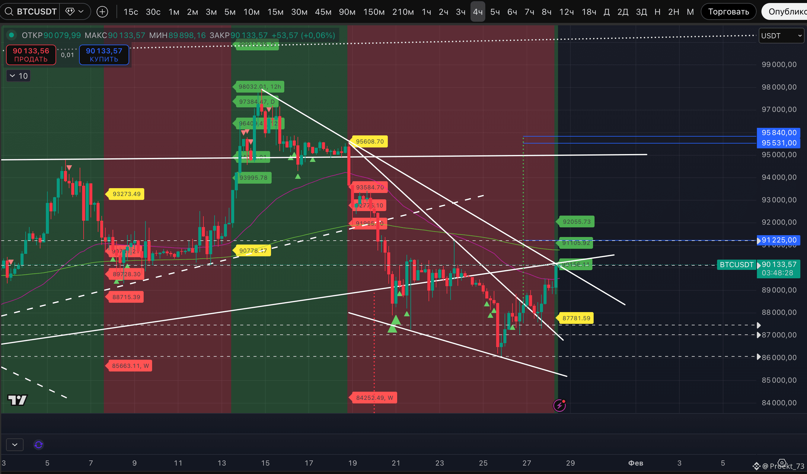 Курс BTC пробивает 90 000$ и перешел в устойчивый аптренд на 4-часовом ТФ. Базовые цели: 90 156$, 91 105$, 92 055$. Уровень потенциального слома: 87 781$.