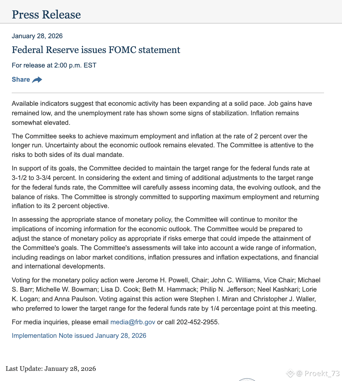 Как и предполагалось, ФРС США сохранила процентную ставку на уровне 3,75%.