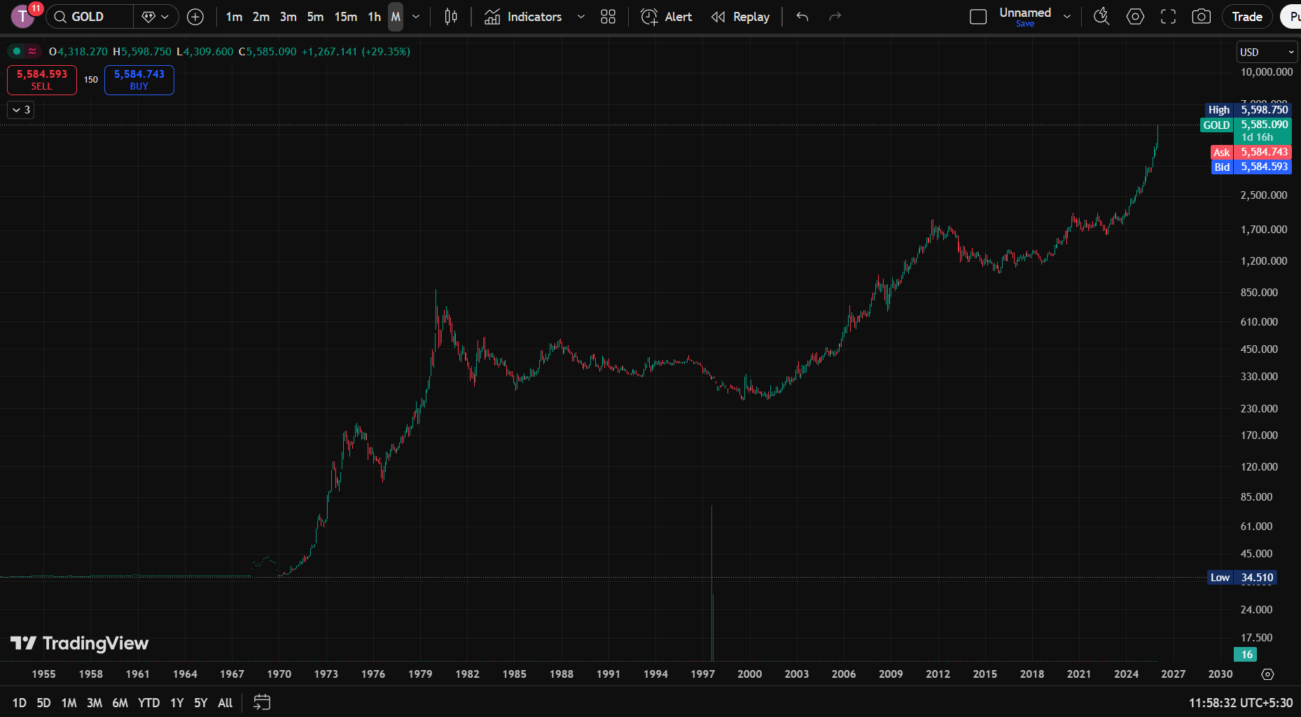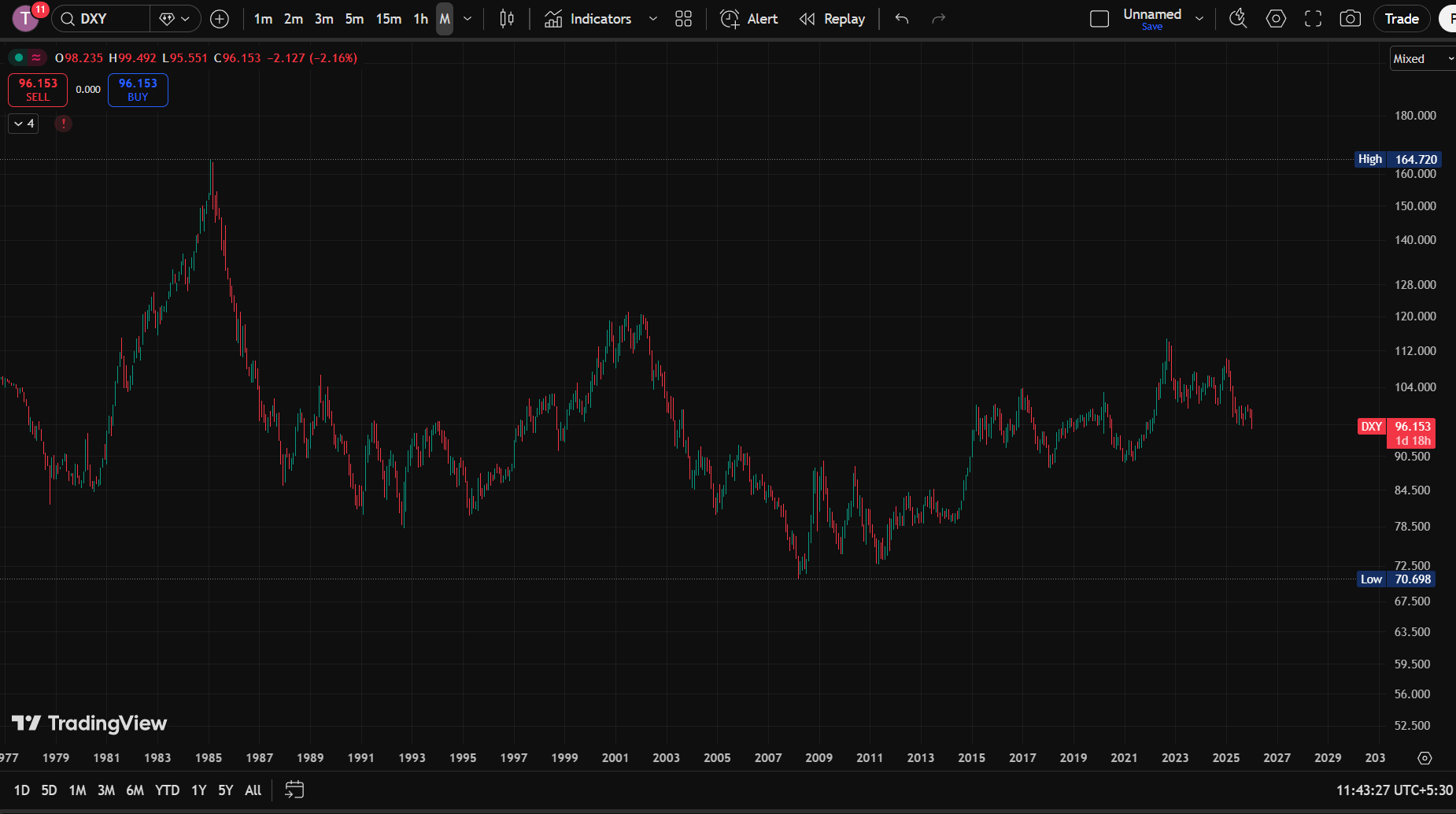 Доллар в настоящее время торгуется рядом с многохлетними минимумами. Это не однодневное движение. Это происходит потому, что рынки облигаций находятся под давлением, долг растет, и неопределенность в политике возрастает. Когда такая среда продолжается, деньги начинают уходить от бумажной ценности и переходить к твердым активам.
