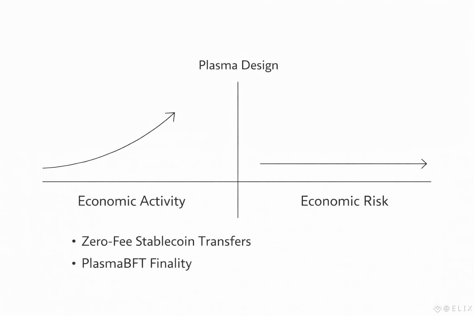 A critical but underappreciated feature of Plasma is how it separates economic activity from economic risk. On most chains, increased usage introduces higher fees, congestion, and settlement uncertainty. Activity itself becomes a source of risk. Plasma removes this coupling. Zero-fee stablecoin transfers ensure that higher usage does not distort costs. PlasmaBFT finality guarantees that once a transaction is confirmed, it is final—no reorgs, no probabilistic settlement, no waiting.