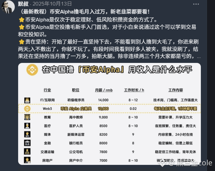 “币安Alpha”推崇为新手低风险积累本金的首选,本质是利用交易所背书,通过刷量提供流动性来赚取空投积分。