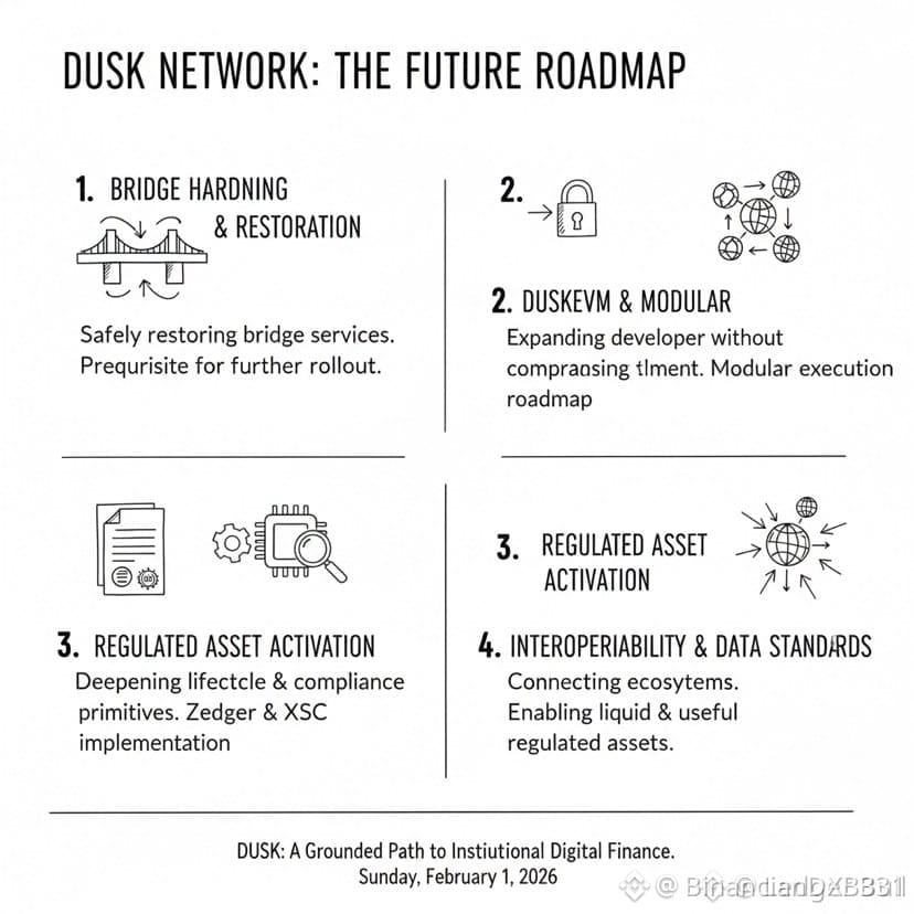 So, what is next, in a grounded way. First, completing the bridge hardening and safely restoring those services. The project itself has framed this as a prerequisite for moving forward with connected rollout steps. Second, continuing to push DuskEVM and the modular execution roadmap, because that is how Dusk expands developer access without compromising the settlement layer design. Third, deeper activation of the regulated asset stack, especially the lifecycle and compliance primitives that make Zedger and XSC more than concepts. Fourth, continuing interoperability and data standard work, because regulated assets do not become liquid and useful if they stay trapped inside one ecosystem.
