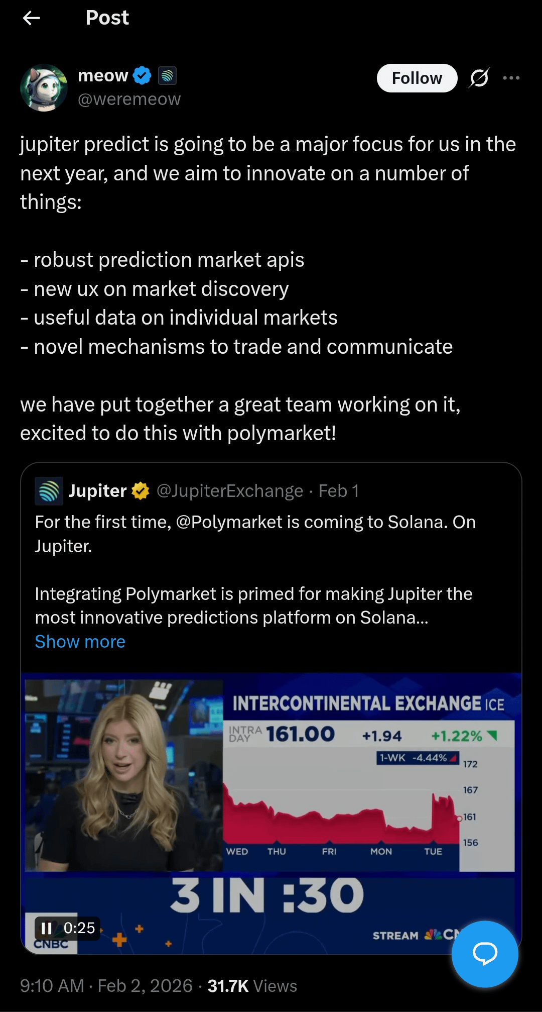 Псевдонимный соучредитель Jupiter meow сказал, что «Jupiter predict» станет основным направлением в следующем году, с запланированной работой, охватывающей API для прогнозных рынков и обновленные инструменты для обнаружения рынка.