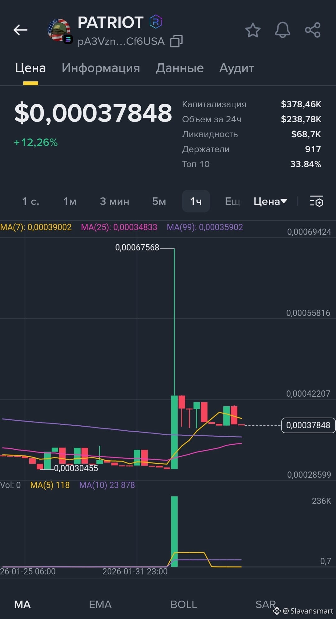 Согласно данным публичного рынка, 💲PATRIOT - это токен малой капитализации с рыночной стоимостью около 3.5💲миллиона, общим и оборотным предложением 10 миллиардов токенов и держателями около 5 690💲. Токен пережил резкие ценовые колебания и скачки объёмов торгов, что является распространённой тенденцией среди мем-коинов, вызванной вниманием к социальным сетям.