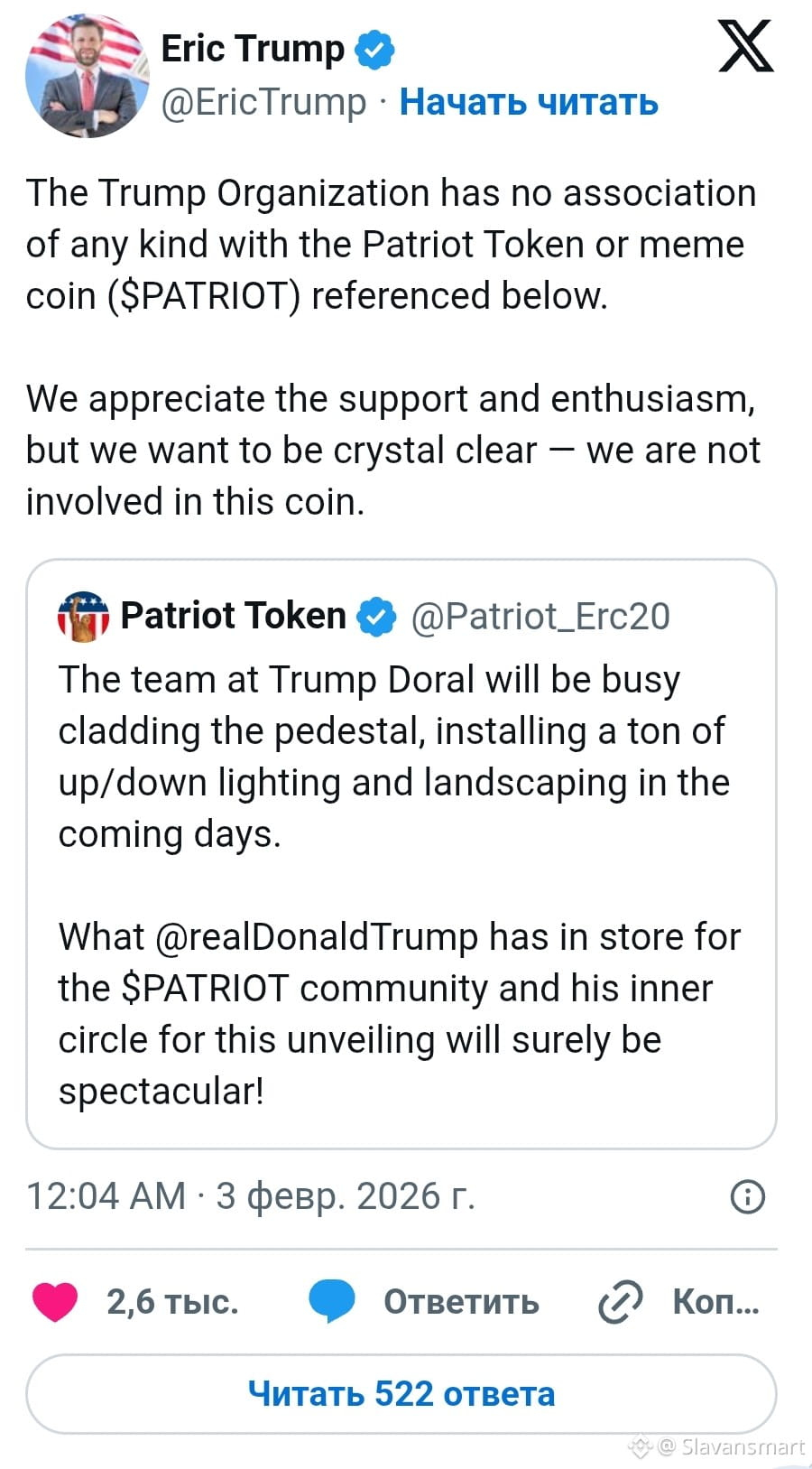 Эрик Трамп прямо ответил, заявив, что Trump Organization "не имеет никакой связи" с Patriot Token или мем-монетой, упомянутой в интернете. Признавая общественный интерес и энтузиазм, он ясно дал понять, что ни компания, ни семья Трампов никак не участвуют в проекте.